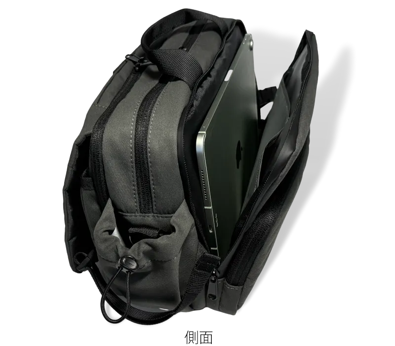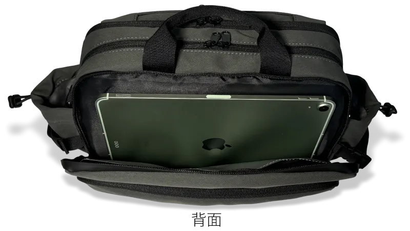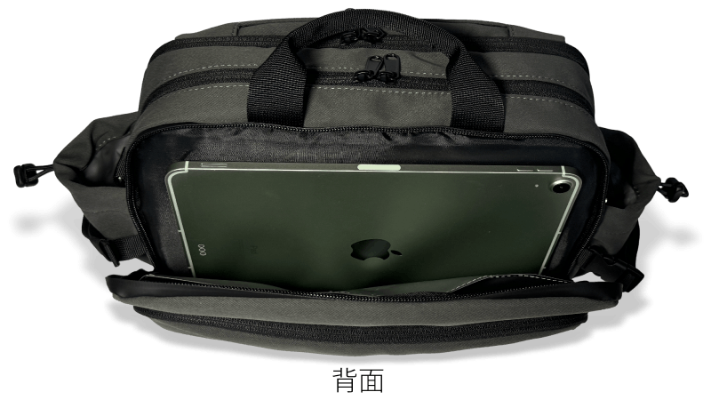 バッグ背面側にある5つ目の収納スペースは、ウレタンクッションを内蔵したタブレット用収納ポケットです。