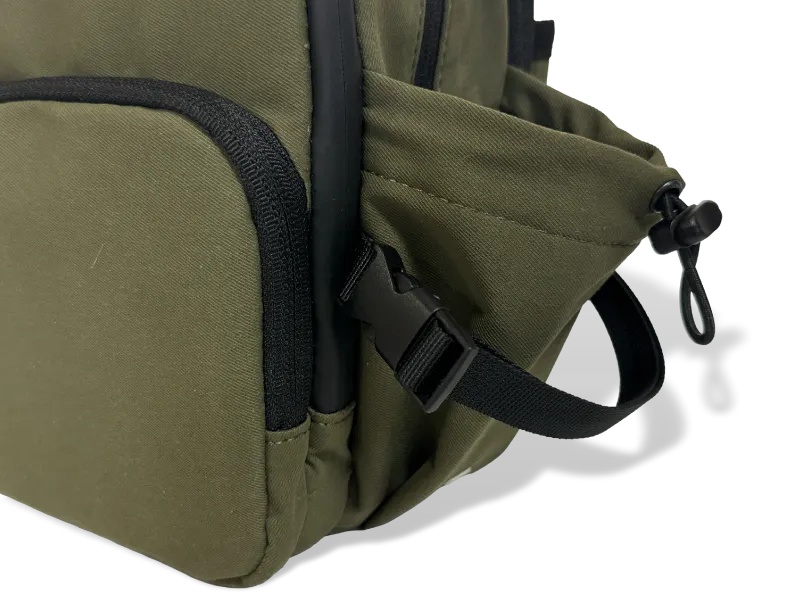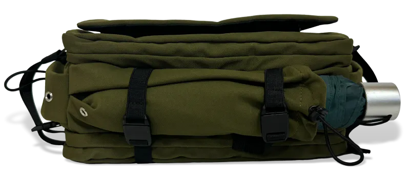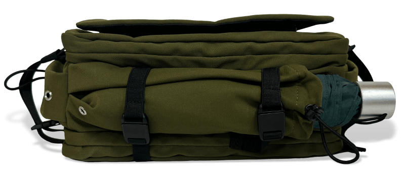 バッグの底面には折りたたみ傘を収納できるポケットと調節可能な2本のストラップが付いています。内側の素材はボトルホルダー同様に水を弾くPVCを採用し、湿気を放出するための鳩目ホールも付けました。