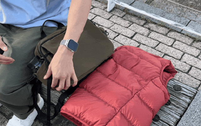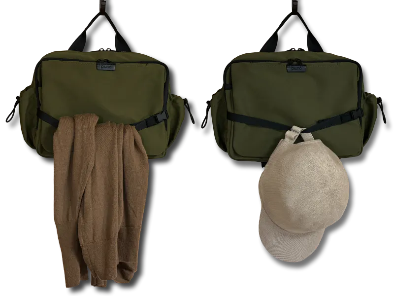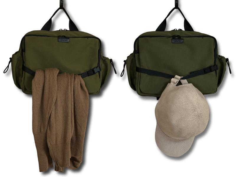 ストラップを正面で繋いだ時は、画像のように羽織物や帽子を掛けたりすることが出来るので、出先で両手を空けておきたい時に便利です。