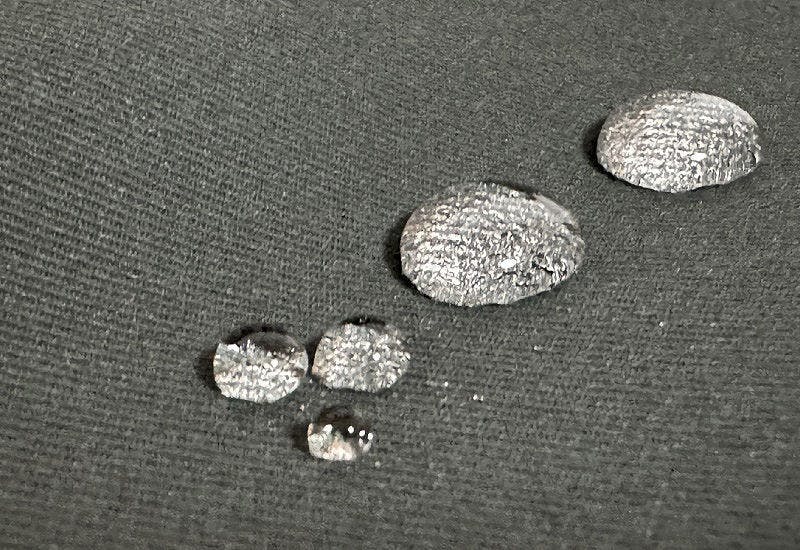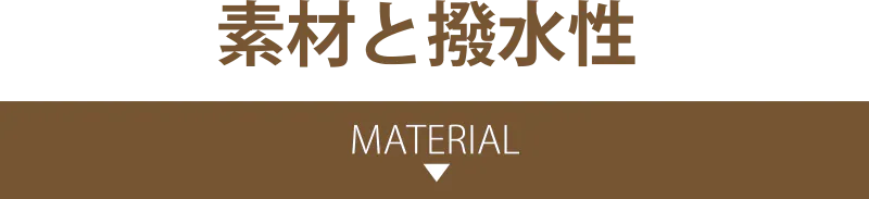 キャンバスのような落ち着いた風合いの柔らかいポリエステル素材で、撥水加工を施しているので、濡れた時でもサッと叩くだけで水滴がはじけてくれます。