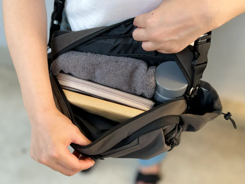 この4つ目のスペースがバッグのメイン収納で一番大きなスペースです。ポーチや、大き目の財布、文庫本、カメラ、折りたためるヘッドホンなども入ります。