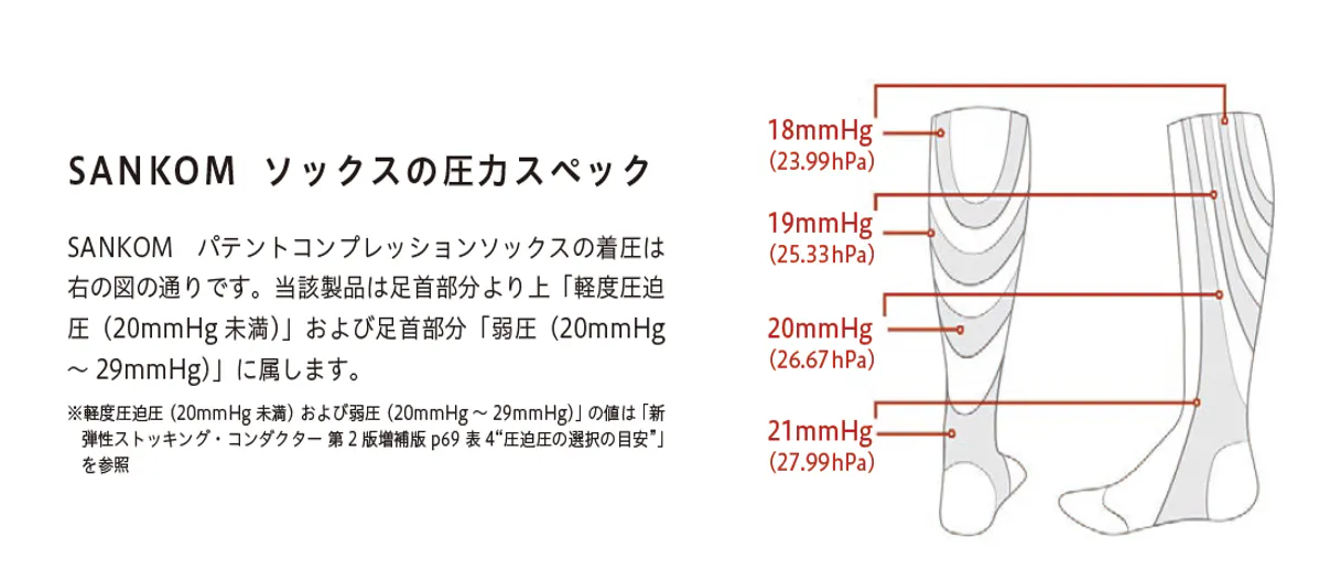 SANKOMのソックスは以下の通りの圧力(着圧)のスペックです。