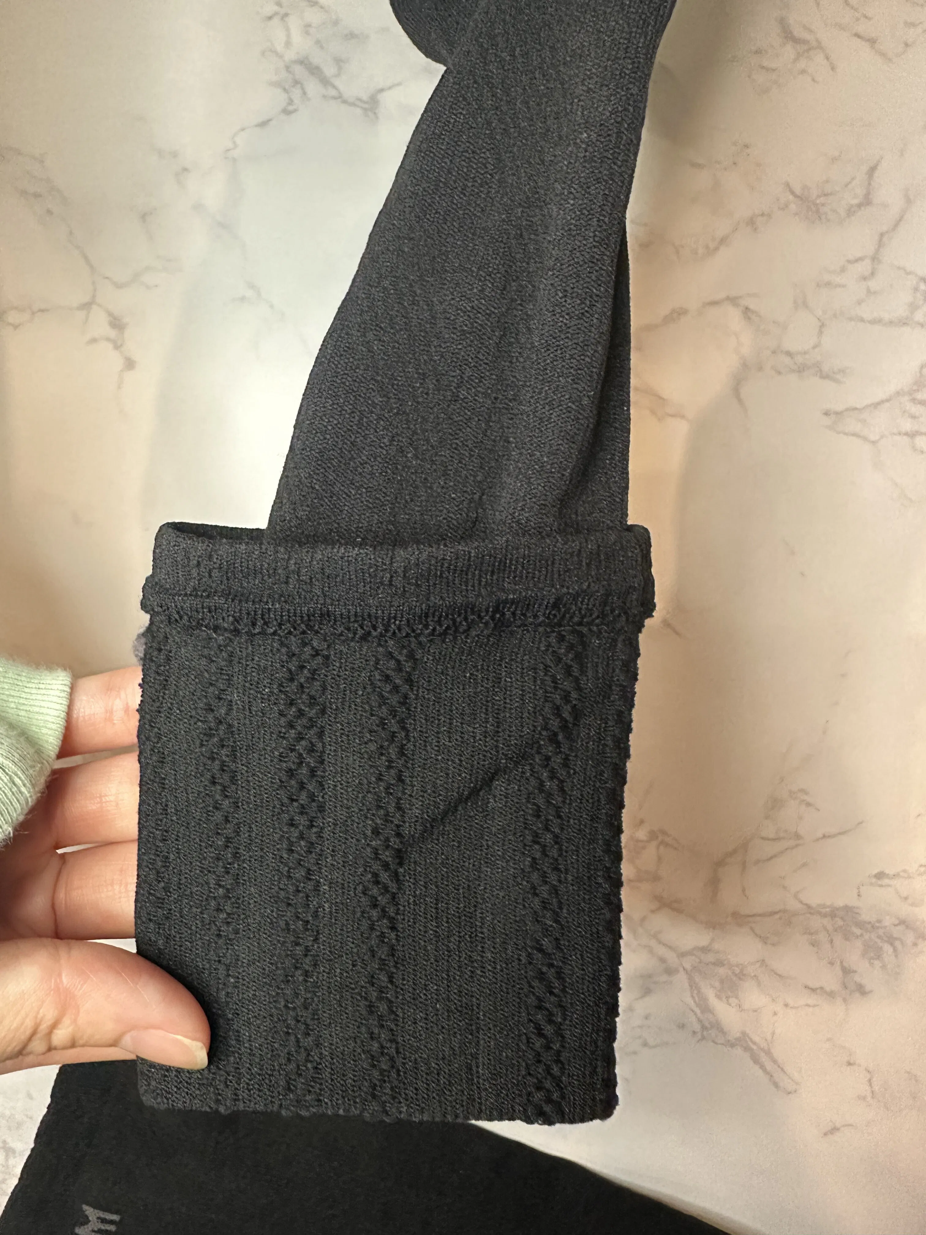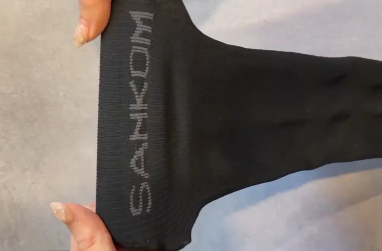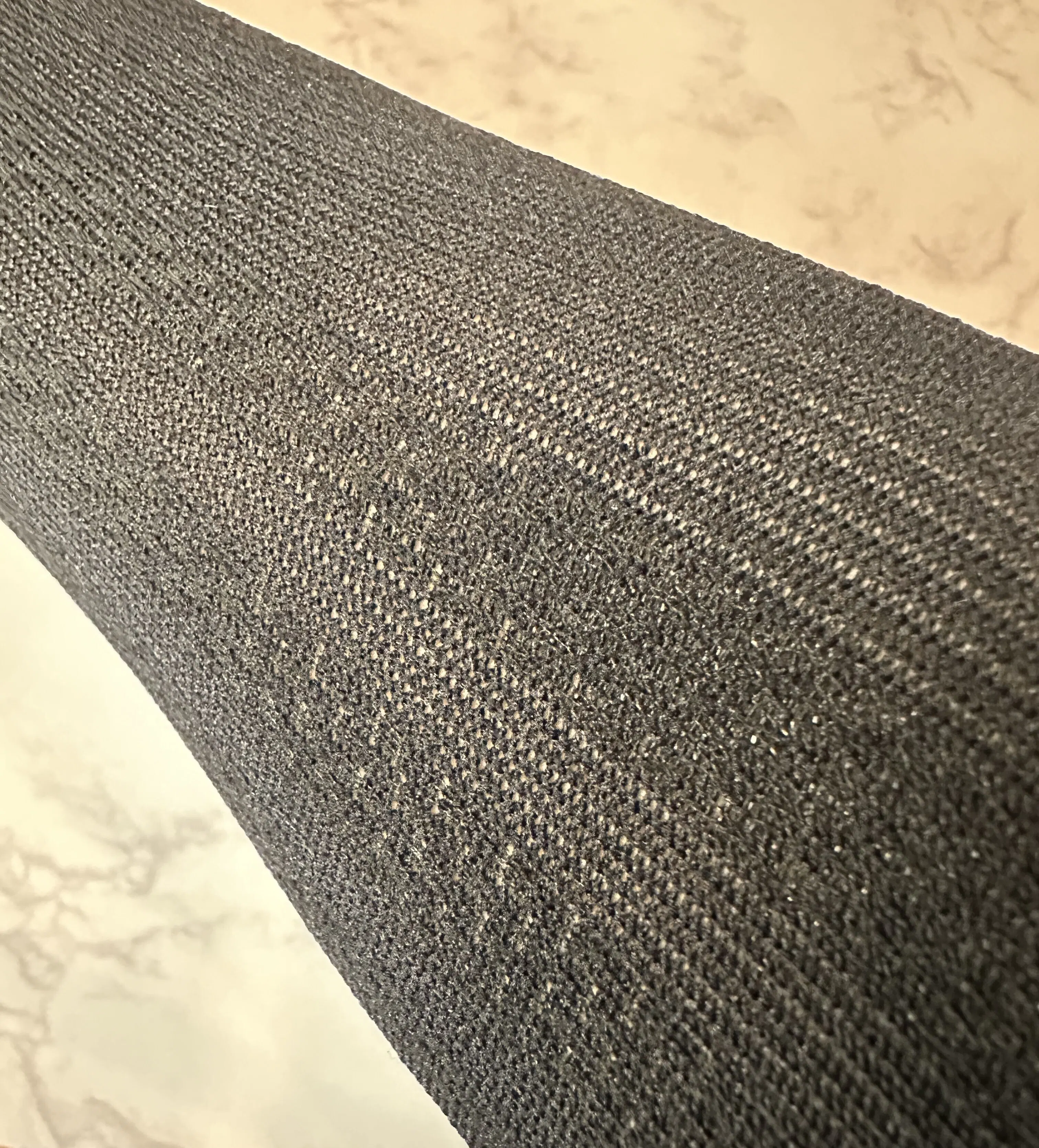 脚の肌が透ける程度の伸縮性をもっています。(少し密度の濃いところが圧着の編み込み部分になります♪)
