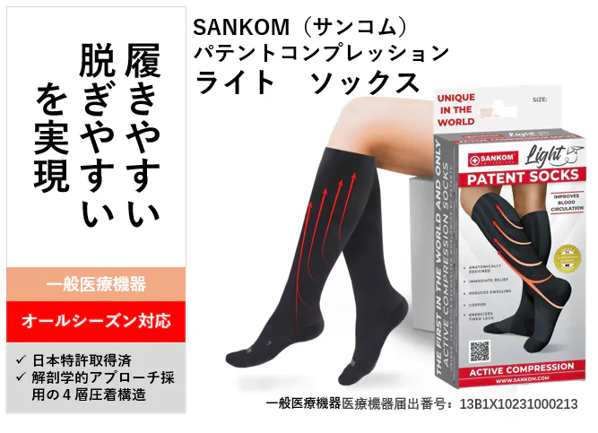 SANKOMのパテントライトソックスは、スイス人医師による開発製品です。一般医療機器である弾性ソックスの役割をと効果を持ちながら、解剖学的にふくらはぎ部分にある静脈構造にのみ圧力を加えることによって、履きやすく、脱ぎやすいを追求しました。