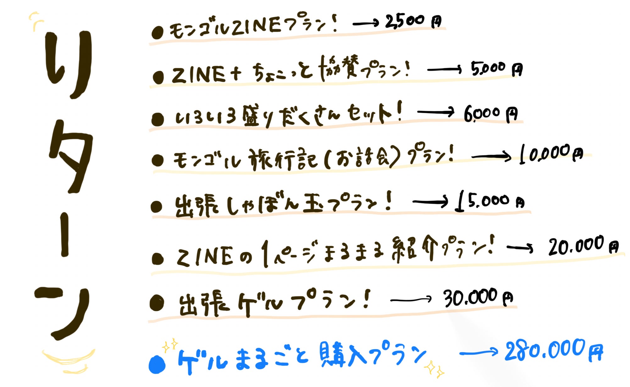 もし「こんなリターンが欲しい!」というものがあったら追加リターンとして出させて頂くので、是非お伝えください!