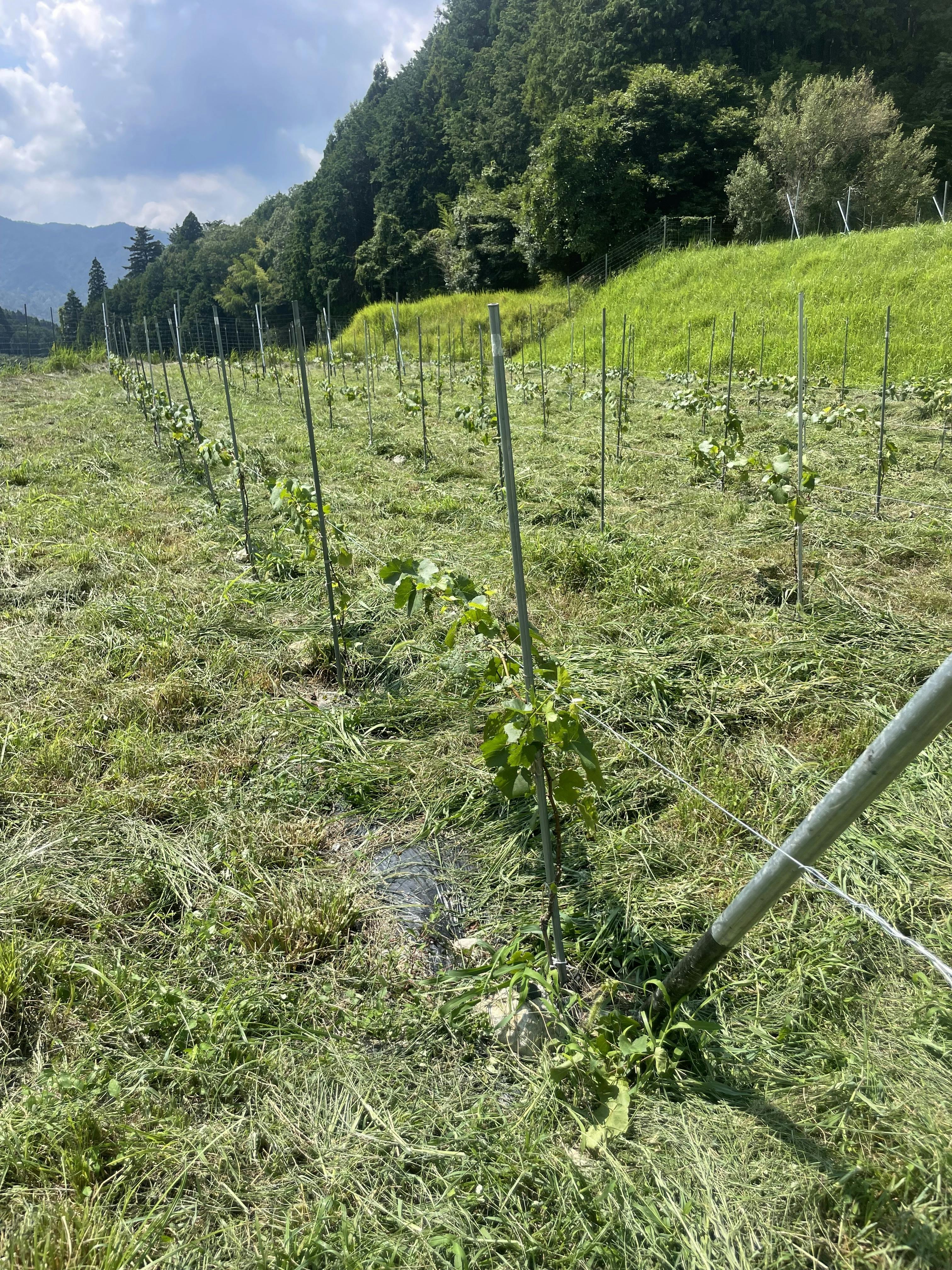 葡萄圃場の葡萄は今年1年で基本的な形を作り、来年には収穫を目指したいと思っています。その為にこの圃場では残りのワイヤーを張る作業と一定間隔でワイヤーを支える中柱が必要です。現圃場と来年も新たに同等の圃場を作る予定をしています。