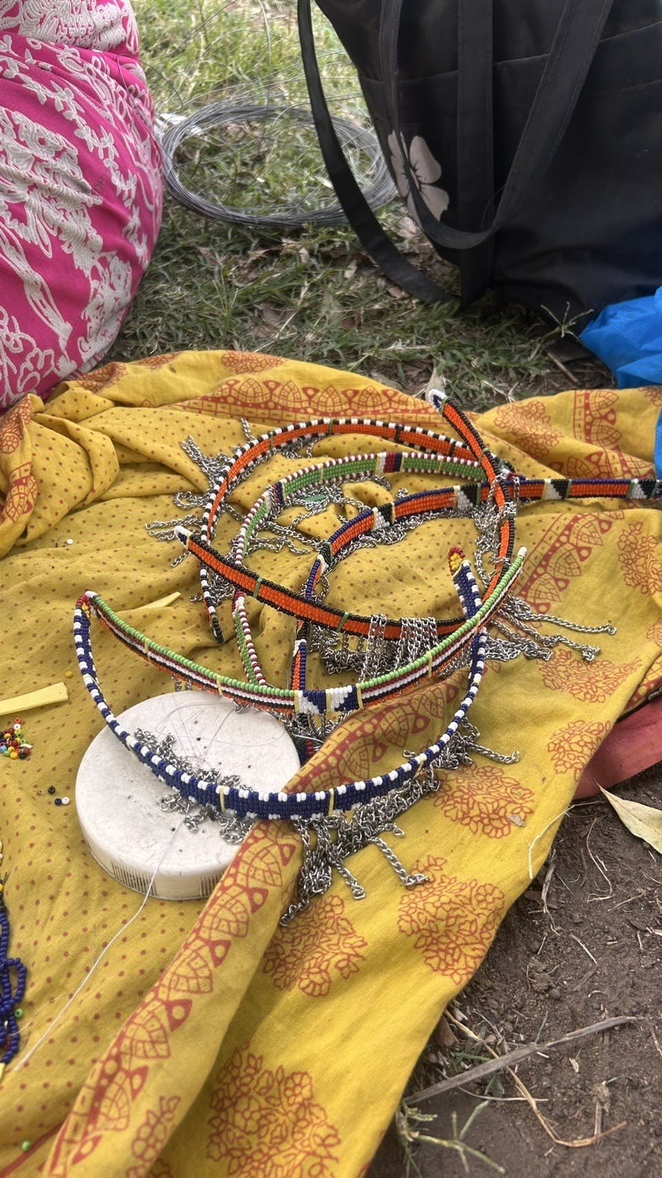 次に伺ったのは、ネックレスを作っているおばあさんのお宅。鮮やかな黄色と水色のシュカ(マサイが日常的に使う布)を身にまとっていて、一目で「素敵!」と思いました。