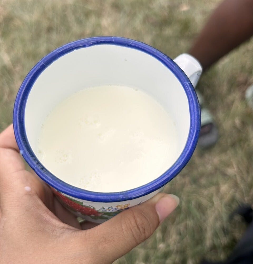 別のお宅では牛乳をごちそうになりました。加熱していない牛乳は少し不安でしたが、断れないので一口。ほんのりヤギの風味があり、ぬるめで出されたのがまたドキドキしました。それでも「マサイガールと言われたい一心」で飲み干しました。笑