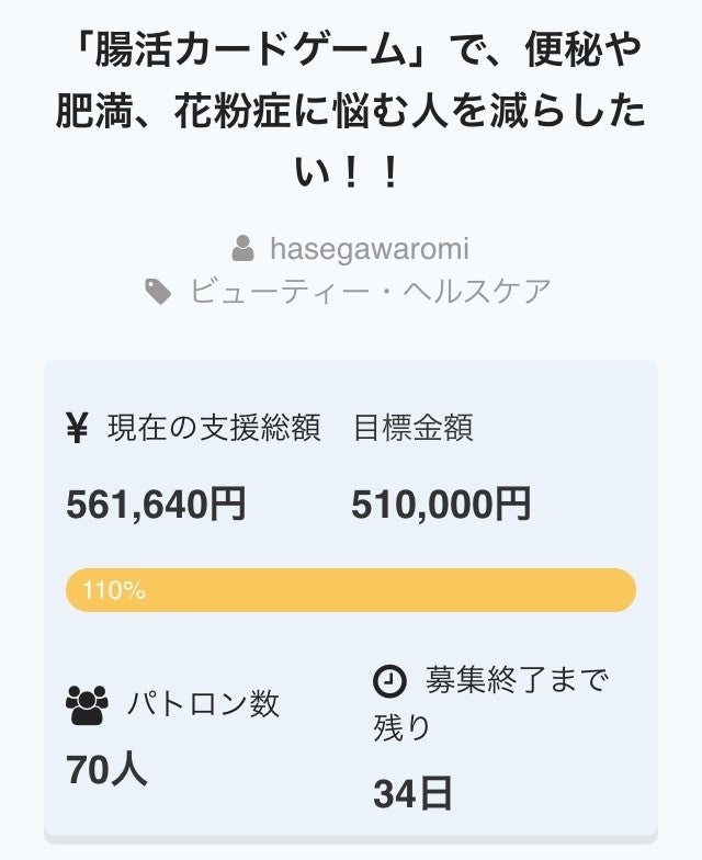 またまたすごーくうれしいお知らせです! なんとこの 「腸活カードゲーム」で、便秘や肥満、花粉症に悩む人を減らしたい!! プロジェクトのパトロンさまが70名に達しました!!! みなさま、ご支援、本当にありがとうございます!!! クラウドファンディングをやる前までは、 友達少ないし、人見知りだし、クラファンムリムリー と思っていました。が、全くそんなことはなかったです。 そういう要素は、あんまり関係ないことを学びました(*´ω`*) でも、そろそろクラファン終了まであと1か月…。 腸活ゲームを知ってもらうために、なにをしたらいいんだろう? をめちゃくちゃ考えています。 今の自分に思いつく方法なんてたかが知れているので、せめて思いつく方法は全部やりたい!笑 そう思っているのには、ちょっと理由があります。 突然ですが、わたし、誰かと戦うの、キライです。笑 たとえ自分がトップを走ってても、「お前に負けないぞー」と言われると やる気をなくして、「お先にどうぞ」と道を譲ってしまいます。 なんどもこりゃいかんと思ってなおそうとしてきましたが、この性質はなかなか変わらなそうです。 でも、最近気が付いたんですが・・・ 誰かと戦えないかわりに、わたしはいつも過去の自分と戦っているみたいです。 今の自分に思いつく方法なんてたかが知れています。 またいつかクラウドファンディングに挑戦する時には、もっといろいろ思いつくと思います。今よりは確実にたくさん思いつきます。 今の自分が過去の自分になった時にちゃんとライバルになれるように、最大級にがんばりたいのです。 未来のわたしのお尻をたたいてくれる方、まだまだ応援募集中です!!笑 引き続きよろしくお願いします!! 腸活WEBメディア「腸内革命」編集長長谷川ろみ