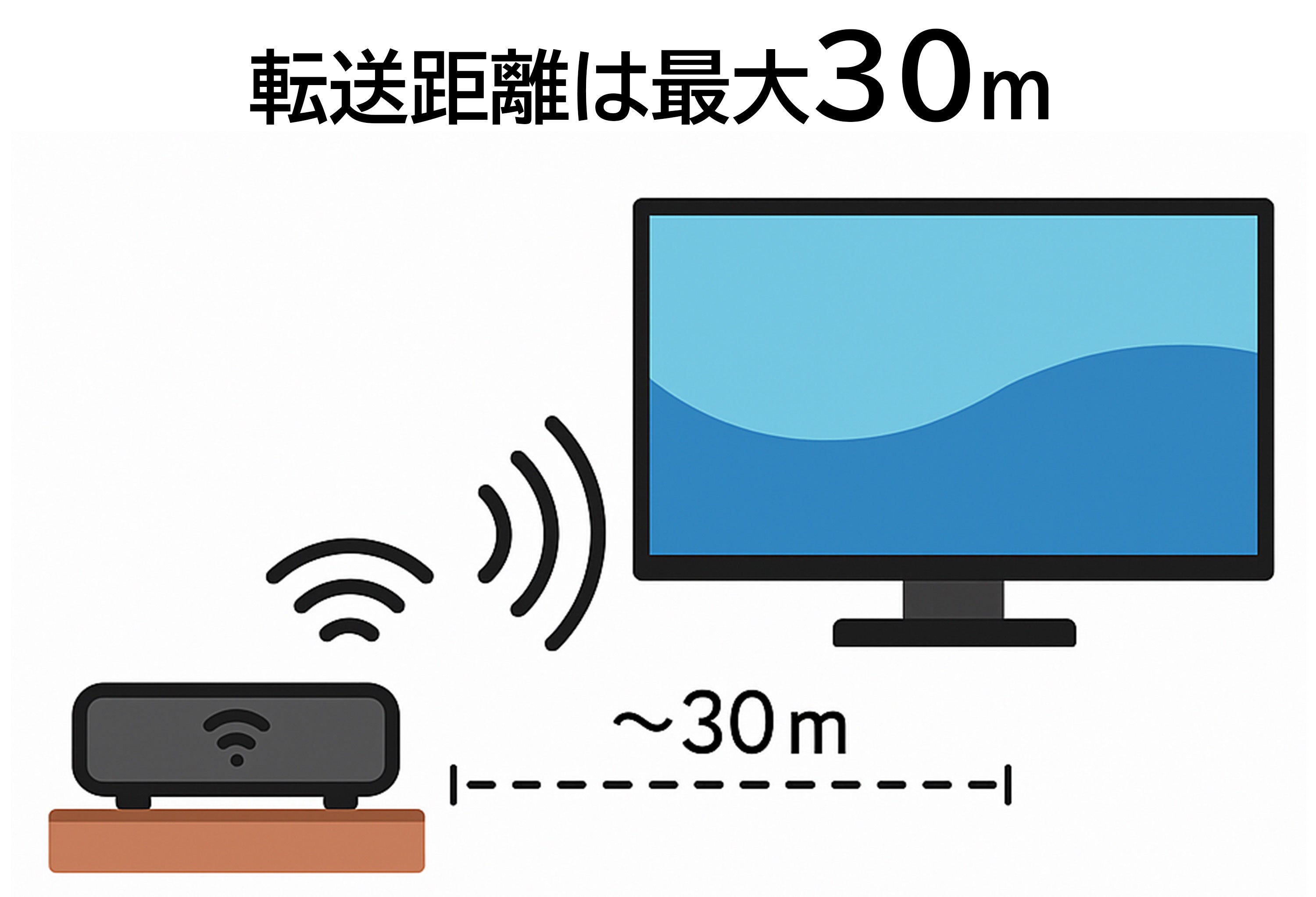 内蔵された高性能チップが、最大30メートルの安定したワイヤレス転送を実現。従来のように長いHDMIケーブルを引き回す必要はありません。