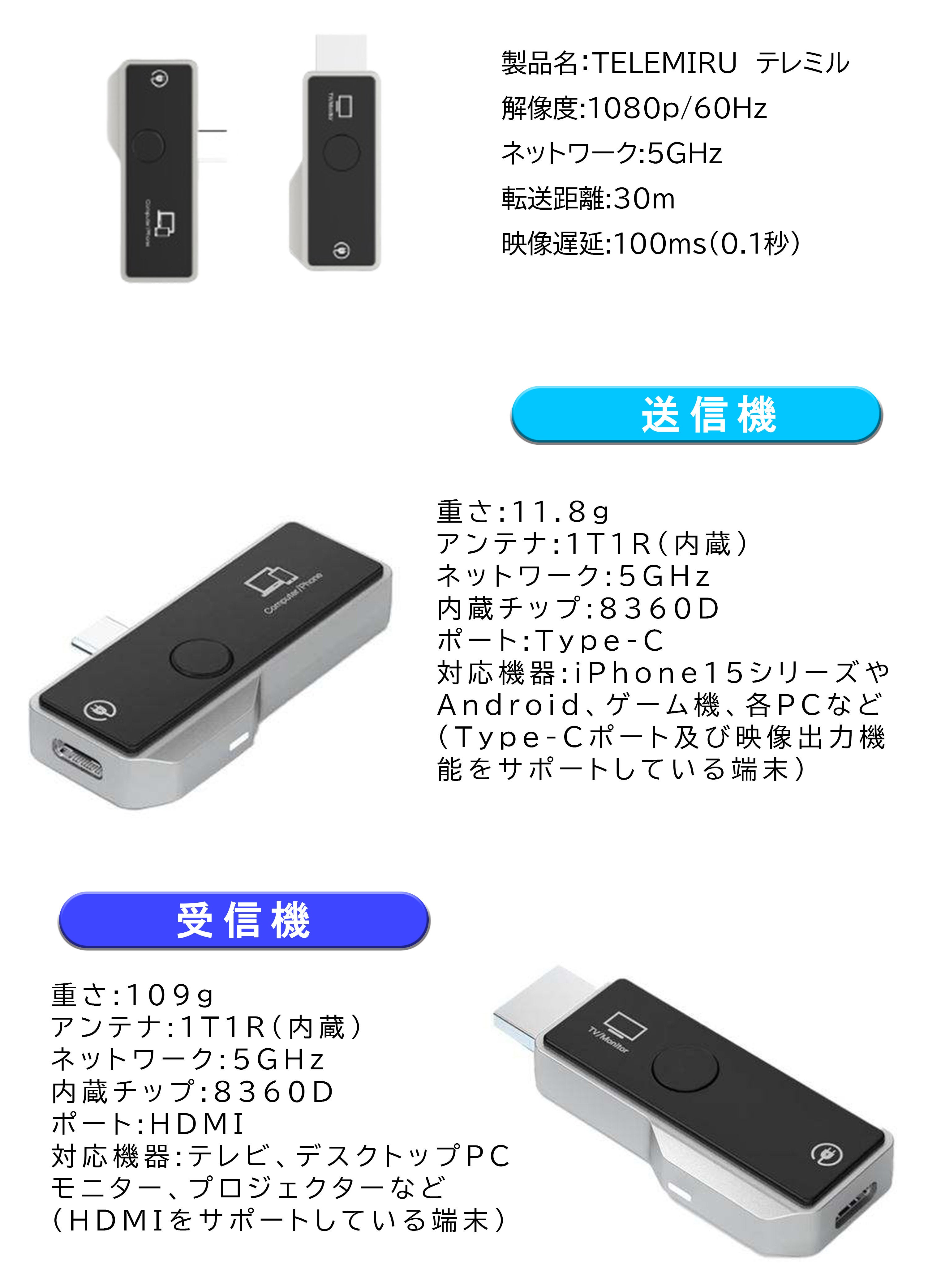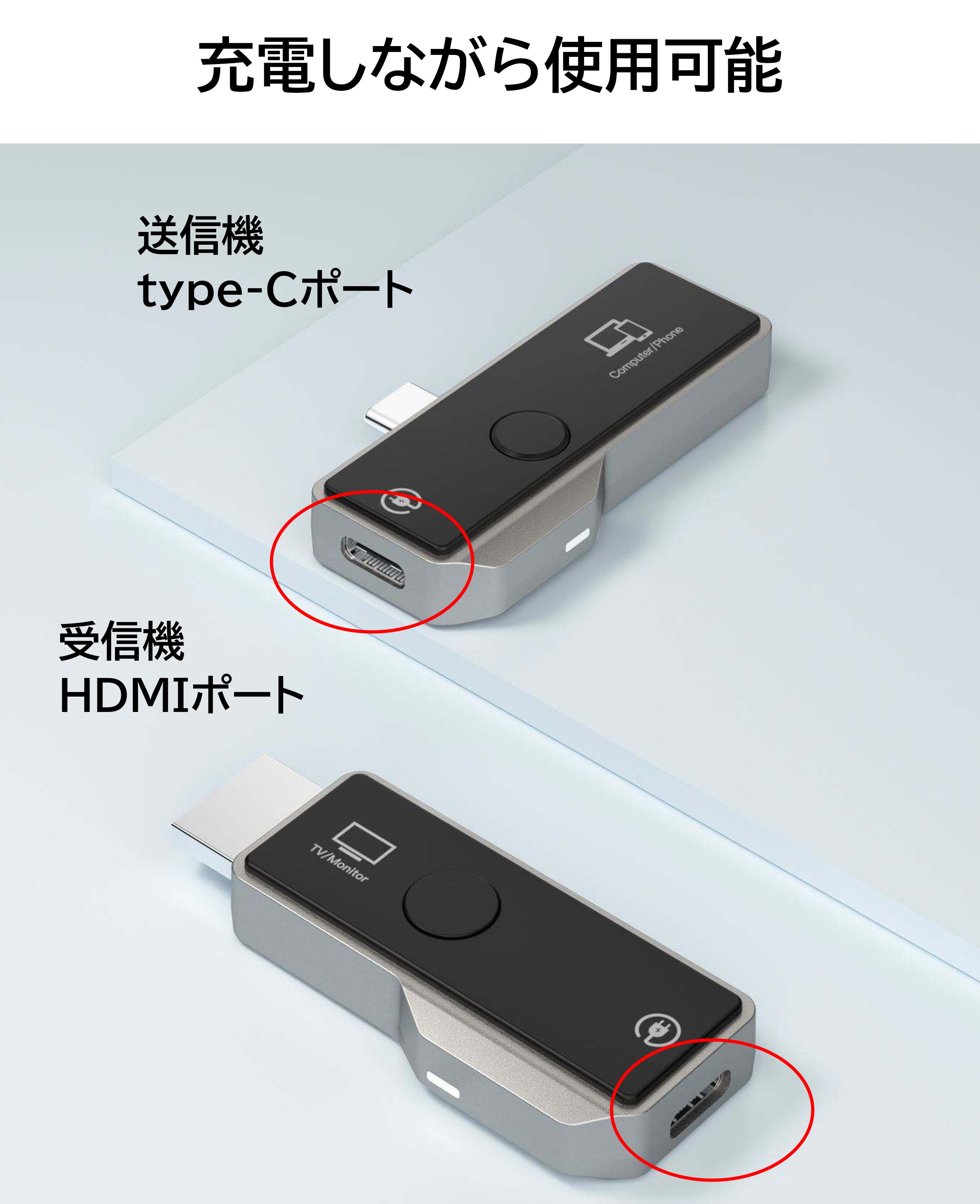 なお、本製品には内蔵バッテリーは搭載されておらず、ご使用時には常時電源の供給が必要です。送信機のType-Cポートおよび受信機のHDMIポートは、映像信号の送信と電力の双方向伝送の両方に対応しています。