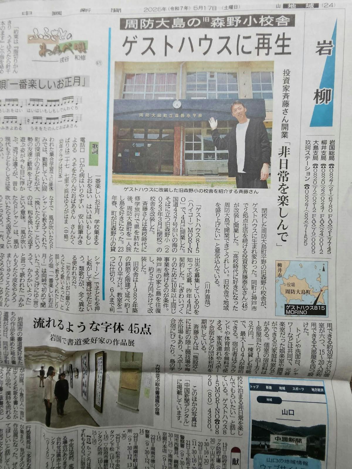 この度、私たちの廃校再生への小さな一歩と、周防大島への熱い想いを、中国新聞(2025年5月17日付)にて大きく取り上げていただきました!