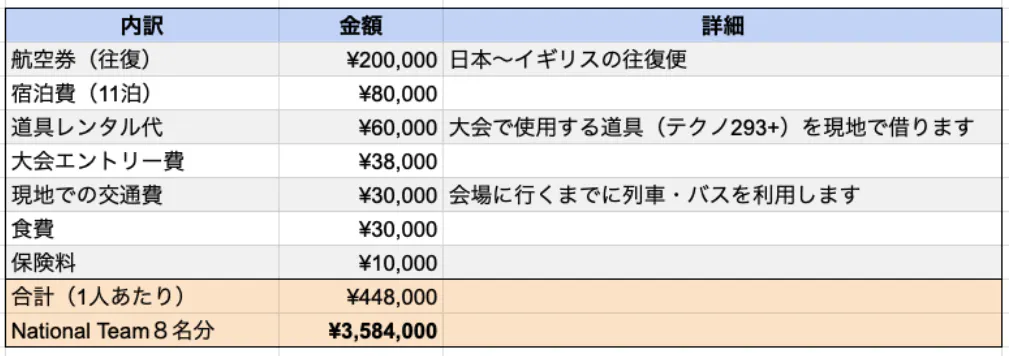 世界大会に出場するにあたり、1人あたり約45万円ほどかかり、NT8名全体では約360万円の費用を想定しています。