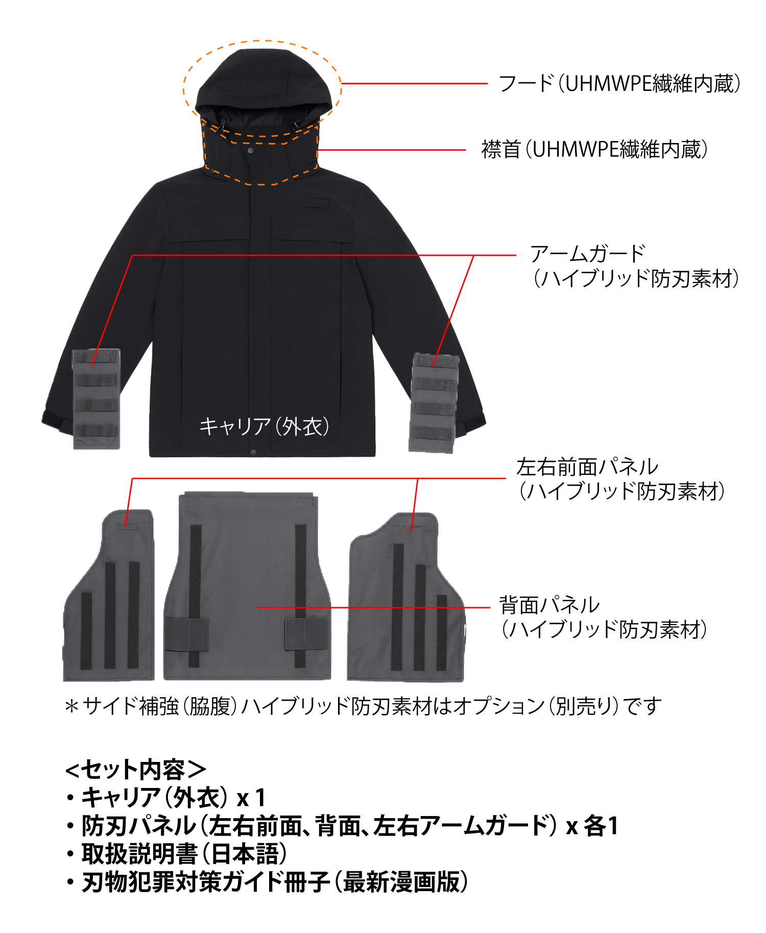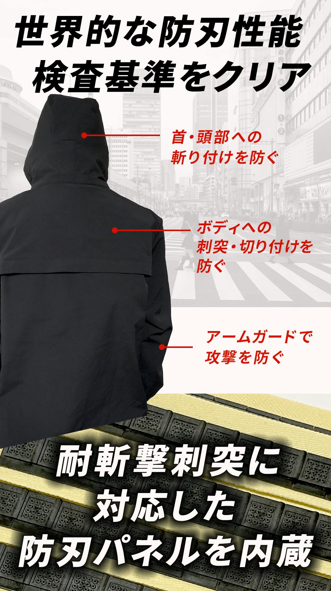 そこで、体幹部(防刃ベスト)だけでなく「首と頭部も防御する」機能を持つジャケットタイプの防刃ウェアをリリースいたします。
