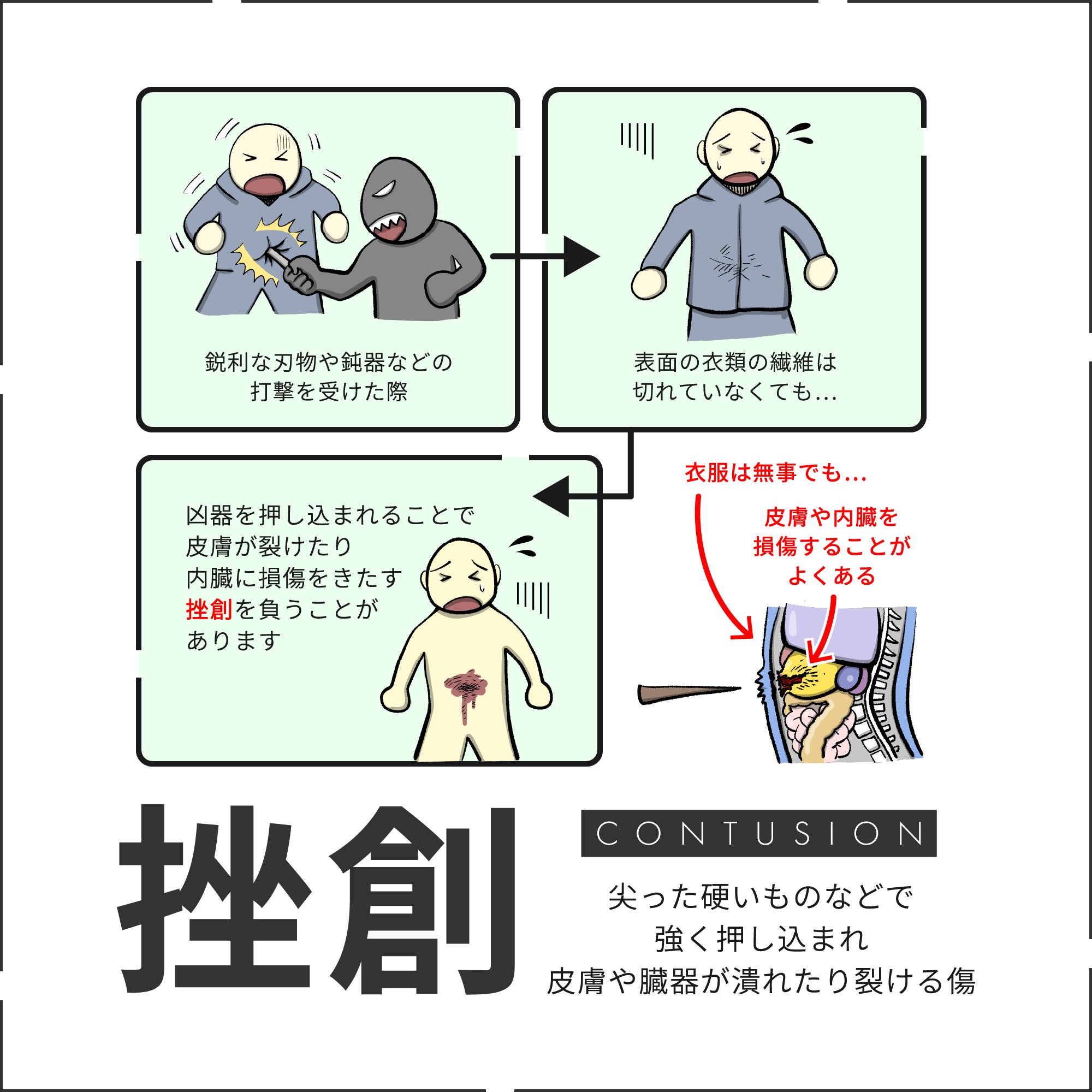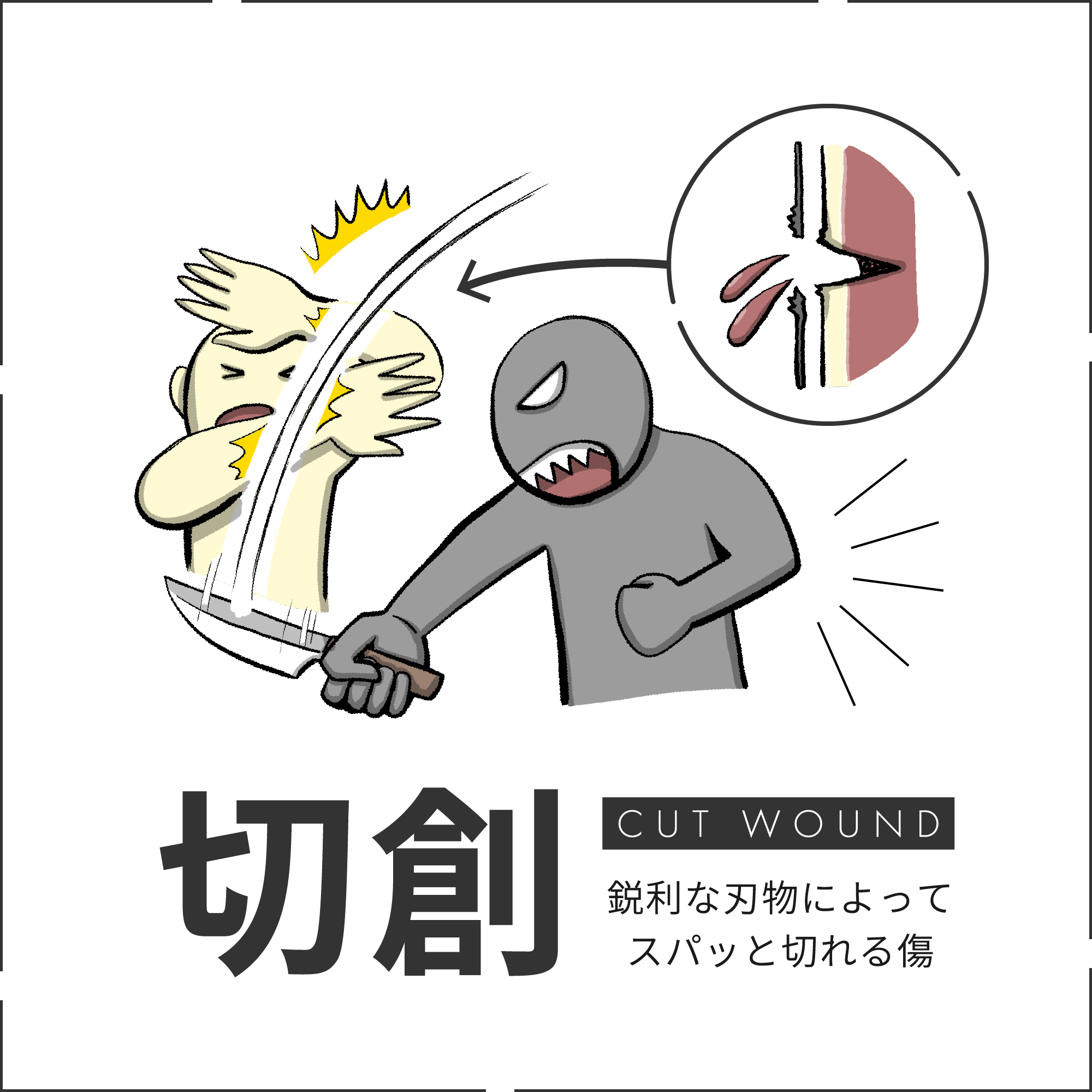 刃物攻撃による受傷は1種類ではありません。切り付けられる「切創」。刺される「刺創」。そして鈍的な外傷である「挫創」も時として命に関わります。