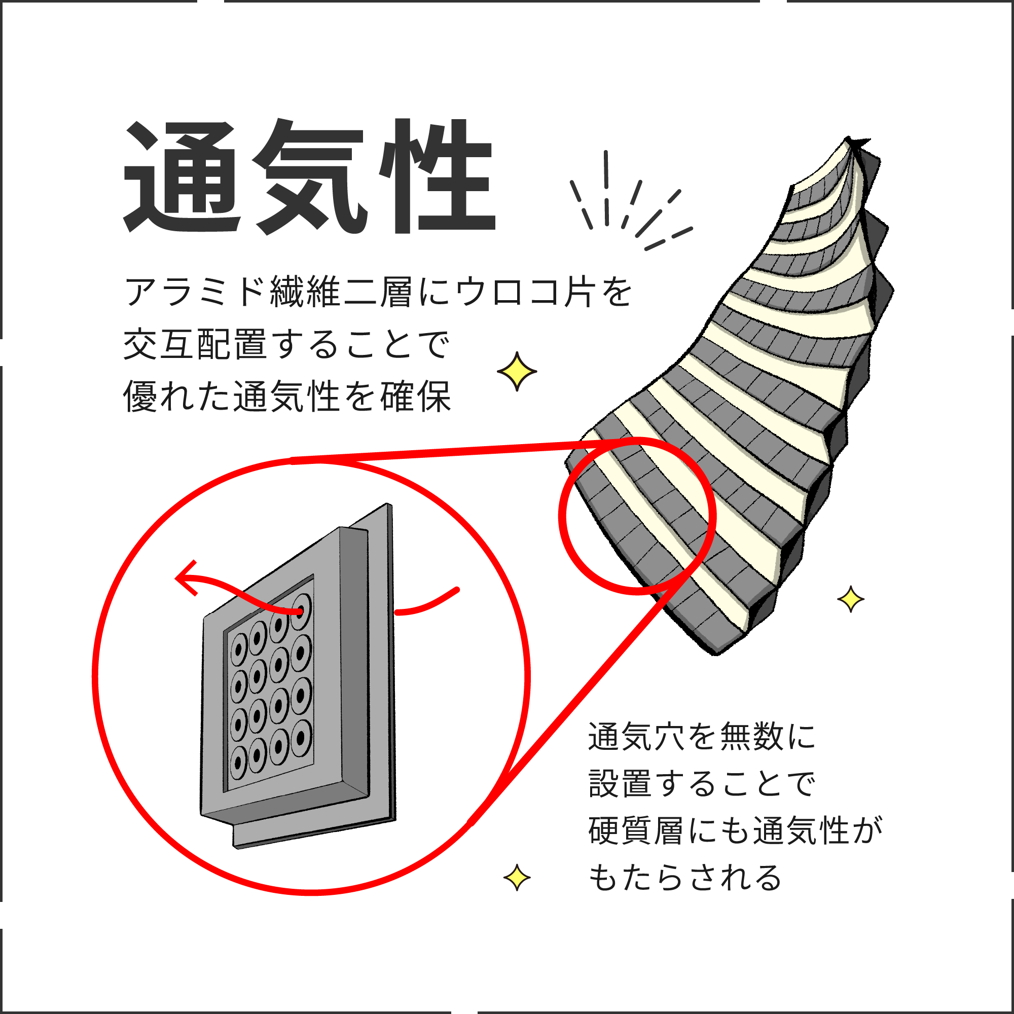 一方で、金属などの硬い素材のみでは、動きにくく重いため、現時点の最適解は『柔軟な防刃繊維』と『硬質樹脂』を組み合わせたハイブリッド素材だと考えています。