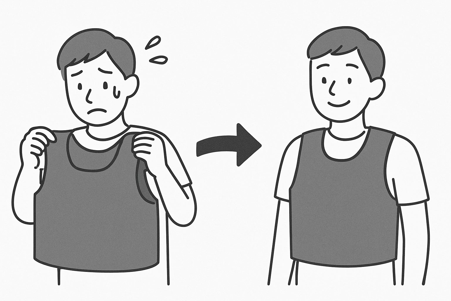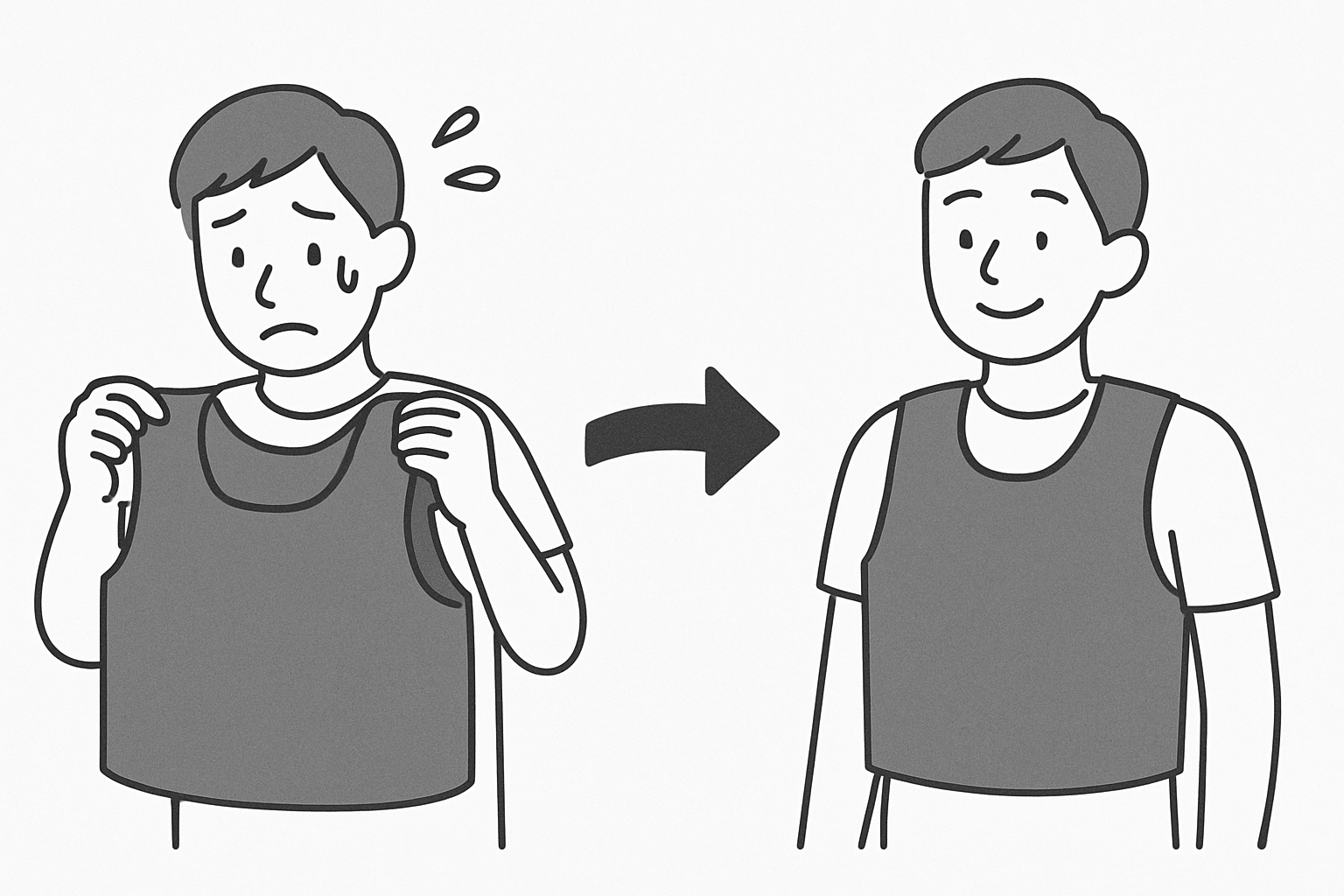 A:柔軟な素材を使用しているため、通常の服の下に着用した状態であれば、外から見て防刃ウェアだと気づかれる可能性は非常に低いです。ただし、体をひねった際や屈んだ際などに内部の防刃パネルが浮き出る場合がありますし、触れた際には素材の感触があります。気になる場合は、ゆとりのある服を上に羽織ることで、より自然に着用いただけます。