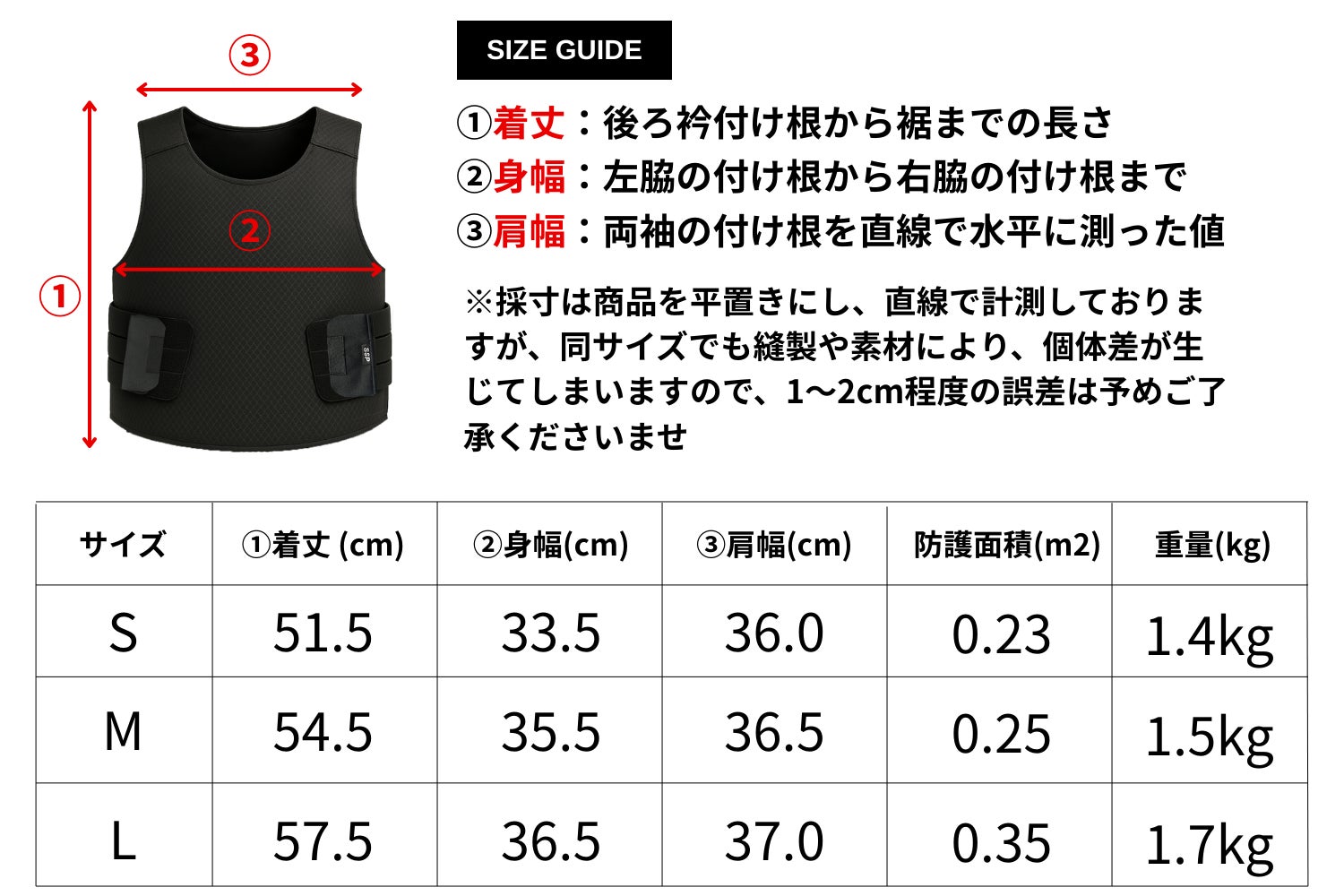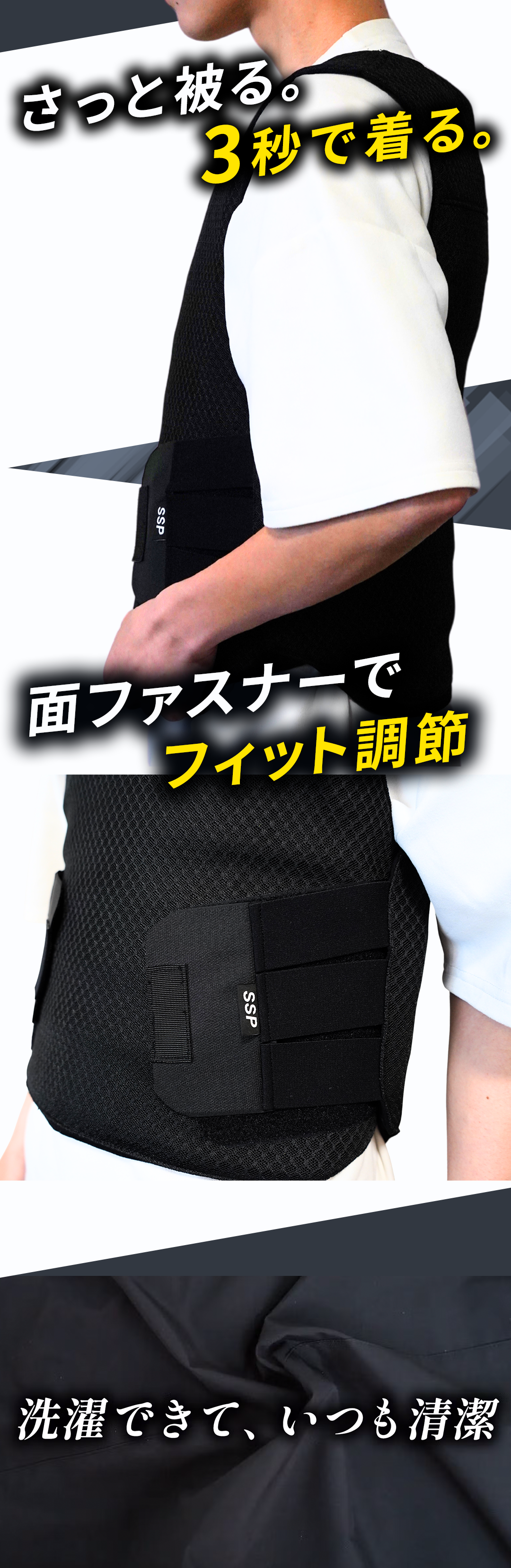 A:従来の金属製などと比べて大幅な軽量化を実現していますが、あくまでも「防刃ベスト」であることをご理解ください。内部には先端技術を採用した防刃パネルが入っており、約1.4〜1.7kg(サイズにより異なります)ほどの重さがあります。密着して着用いただくとそれほど重さは感じませんが、ある程度の締め付け感はございます。