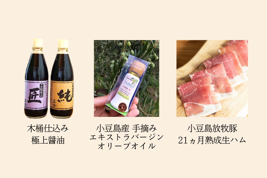また、応援したいけど小豆島までは行けないという方には、私たちおすすめの特産品をご用意いたしました。地元生産者様のご協力のもと、島のおいしいものを自信をもってお届けします。