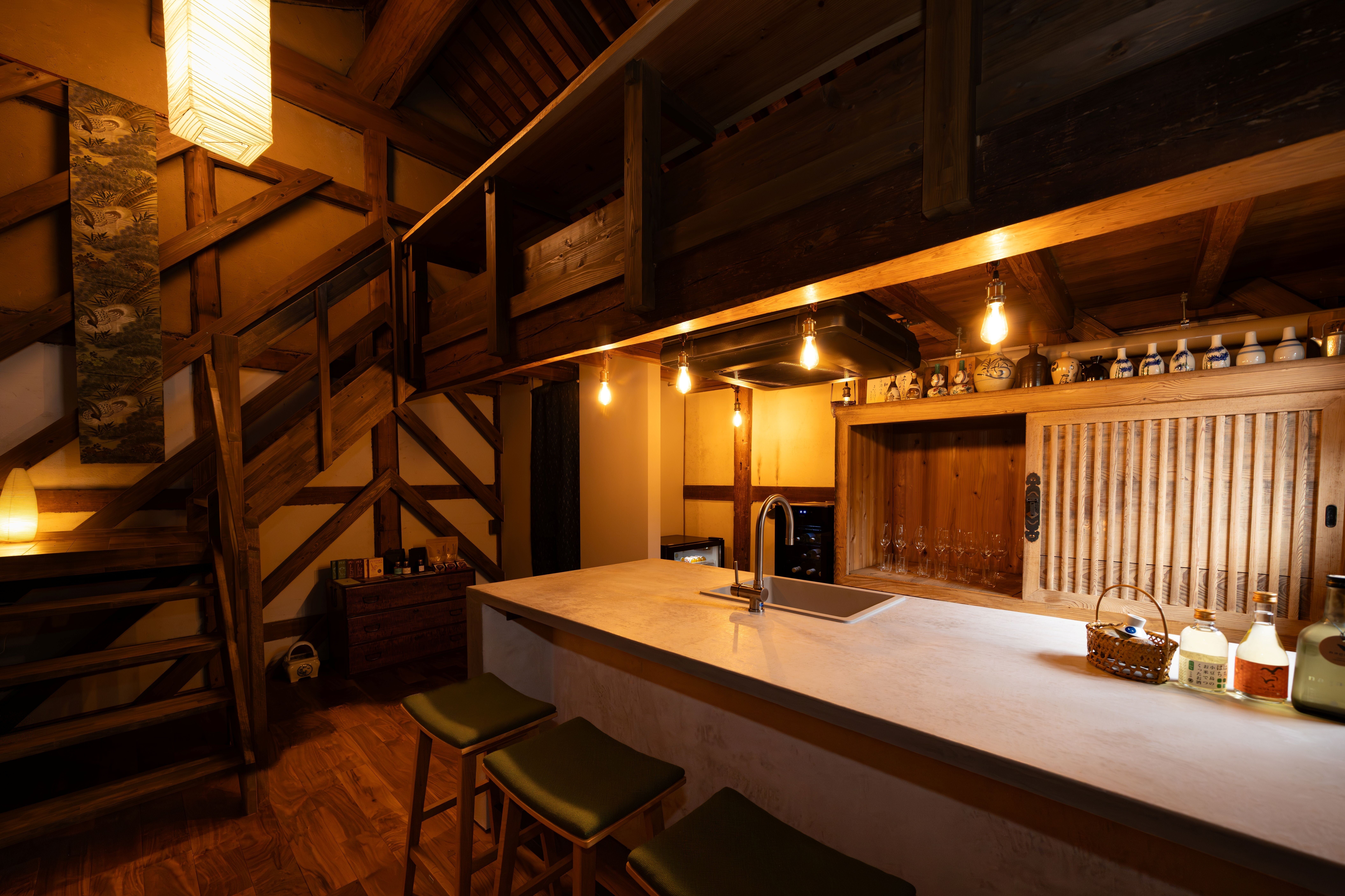 ■間取り:寝室 4部屋(ベッド 7、布団 2), キッチン, リビング, トイレ 2, 半露天風呂, サウナ, シャワールーム, 蔵BAR(宿泊者専用)、月見台