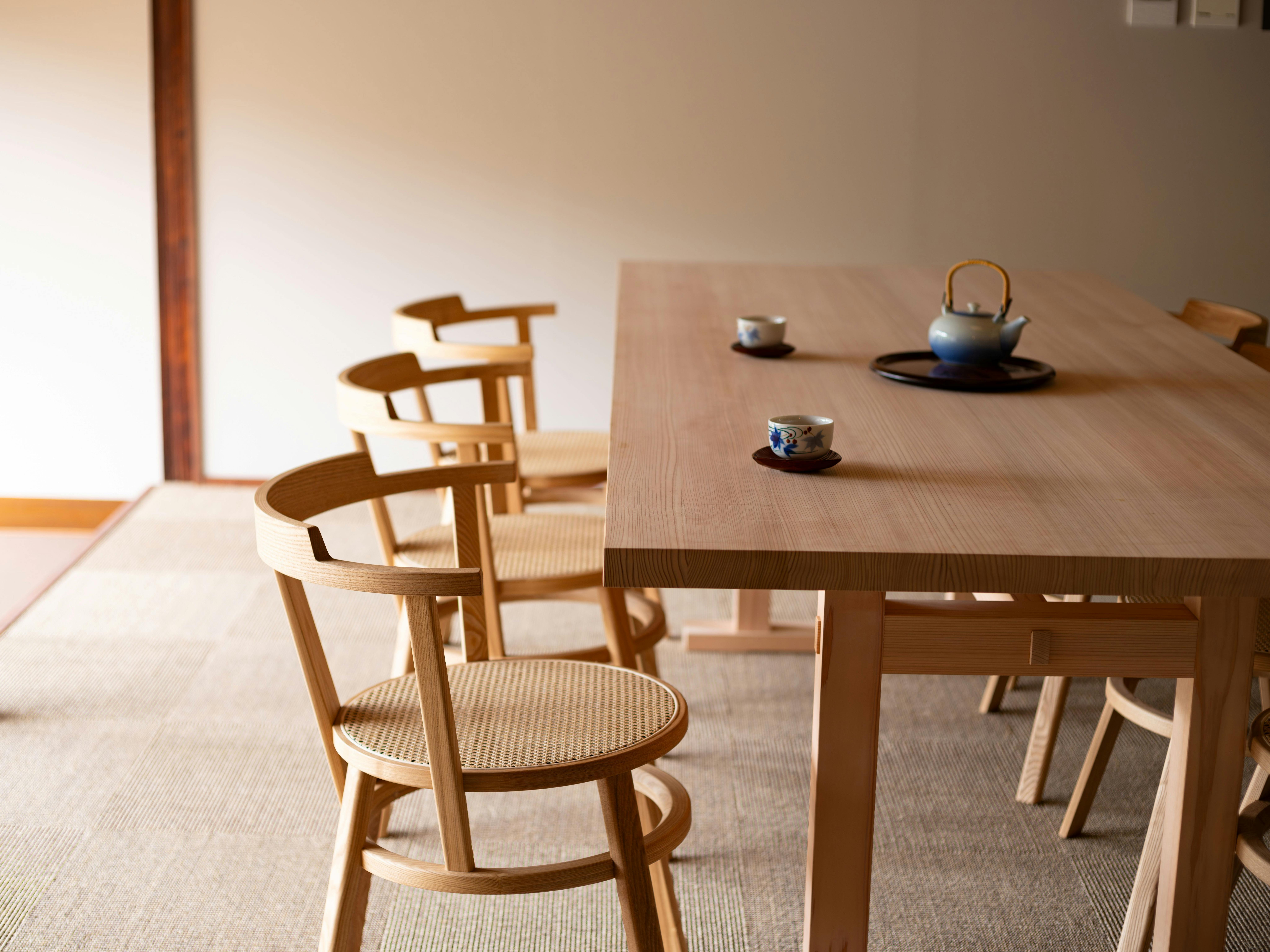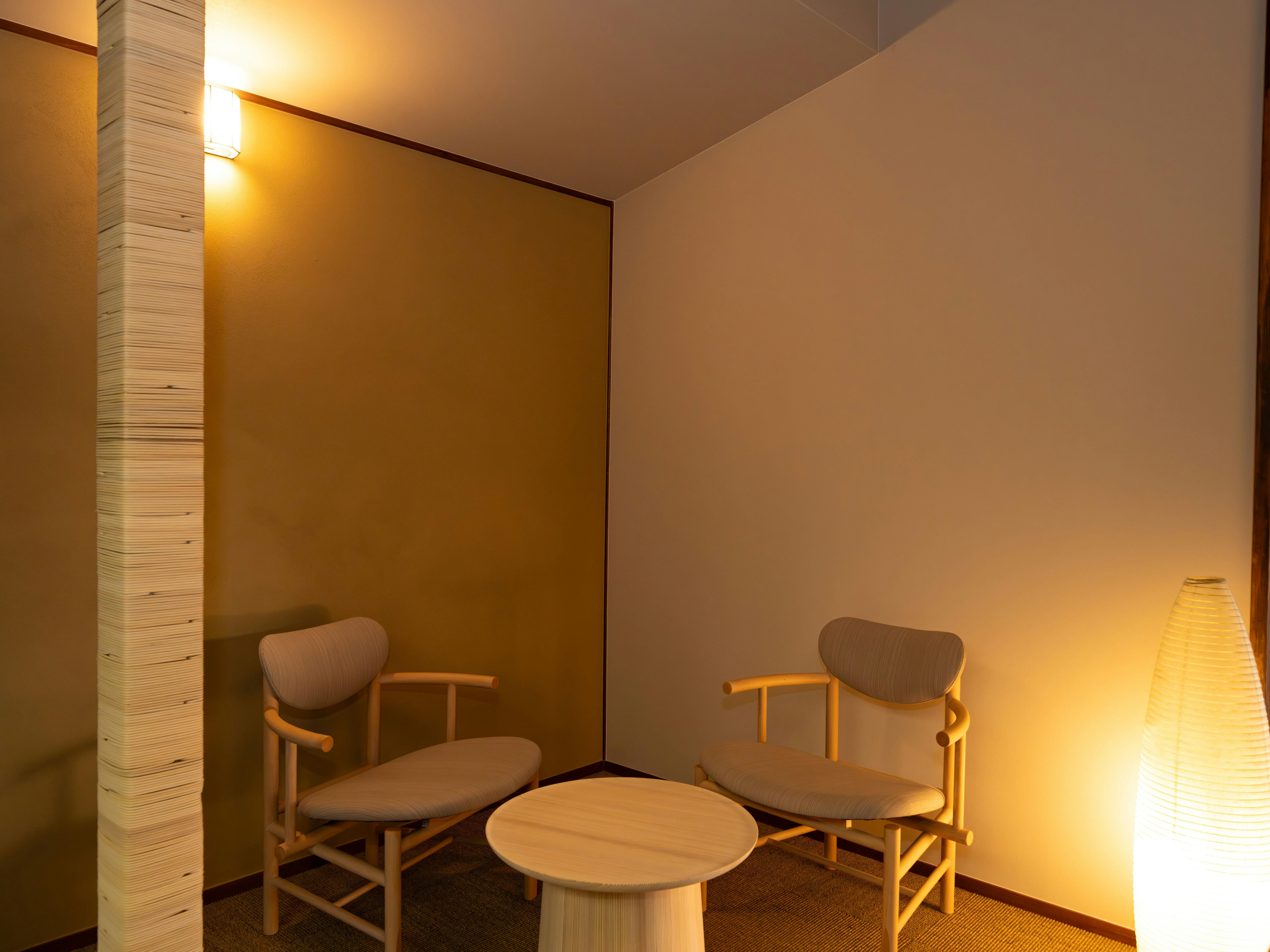 家具は、香川県の桶職人による「Zen」(テーブル)と建築家 中村 拓志氏デザインの「Takenoko chair」(チェア)です。一枚一枚丁寧に削られた吉野杉の優しい手触りと木肌の温かみを感じながら、ゆったりと時間を忘れて読書などはいかがでしょうか。