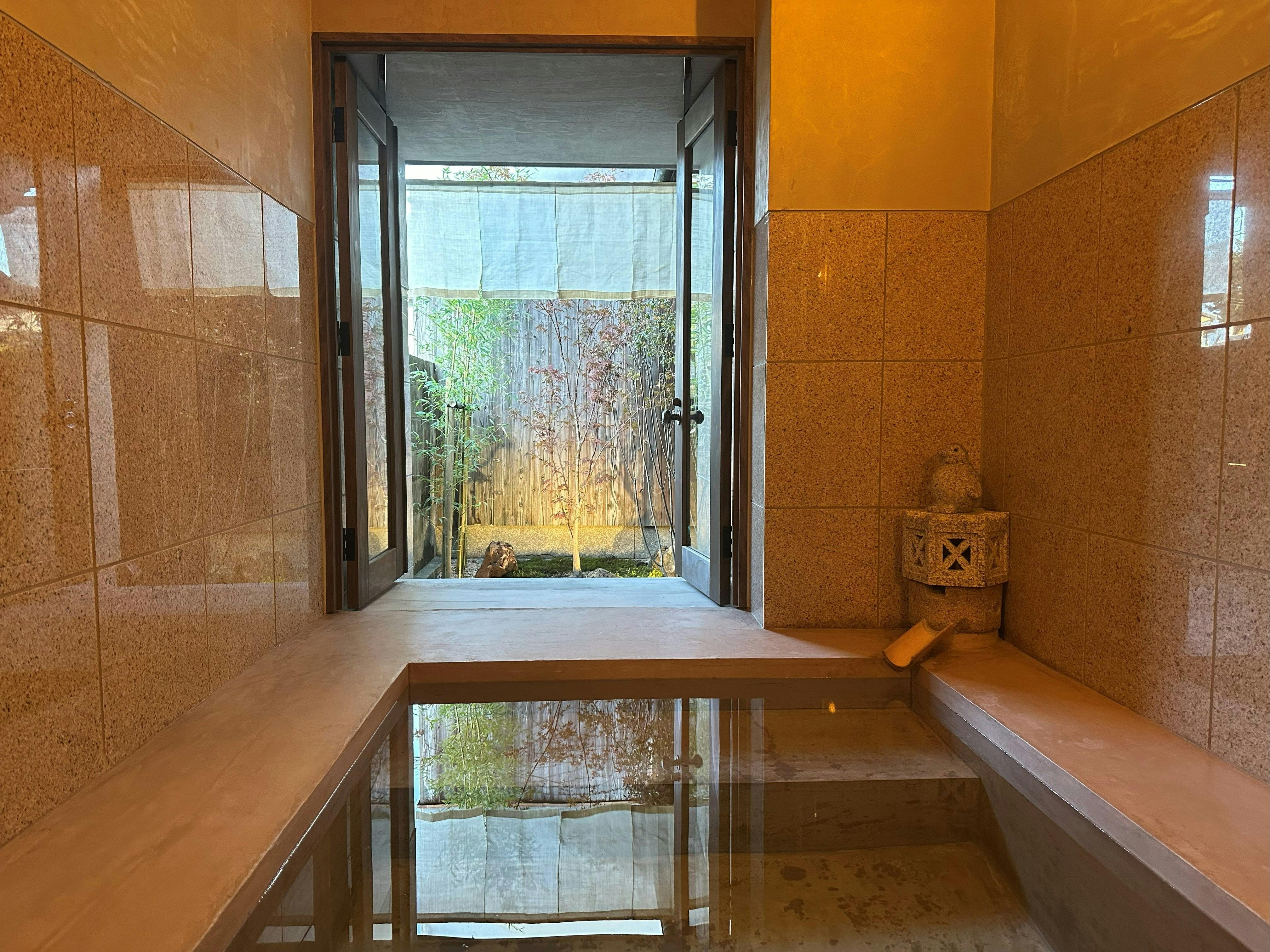 外の風を感じ、ライトアップされた坪庭を眺めながらの入浴は、時を忘れさせてくれます。お湯は、井戸水を濾過した天然水です。入浴された方からは、お湯が良かった、お肌がツルツルになったと、喜んでいただいております。