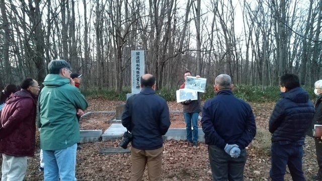 2025年11月30日(日)北見市内の教職員組合主催の学習会に講師(説明パネルをもって囚人道路の解説をする、オホーツク自治研のメンバー)として参加。参加者10名の小さな学習会・フィールドワークでしたが、「オホーツク民衆史講座」の財産を、教育現場で働く先生方に伝えることが出来ました。今回のフィールドワークでは、佐呂間町栃木神社(足尾銅山鉱毒事件の谷中村から集団移住してきた地)と、遠軽町瀬戸瀬の「山神碑」「国道開削殉難者慰霊碑」(道路建設で亡くなった囚人達を慰霊する碑)を訪れました。
