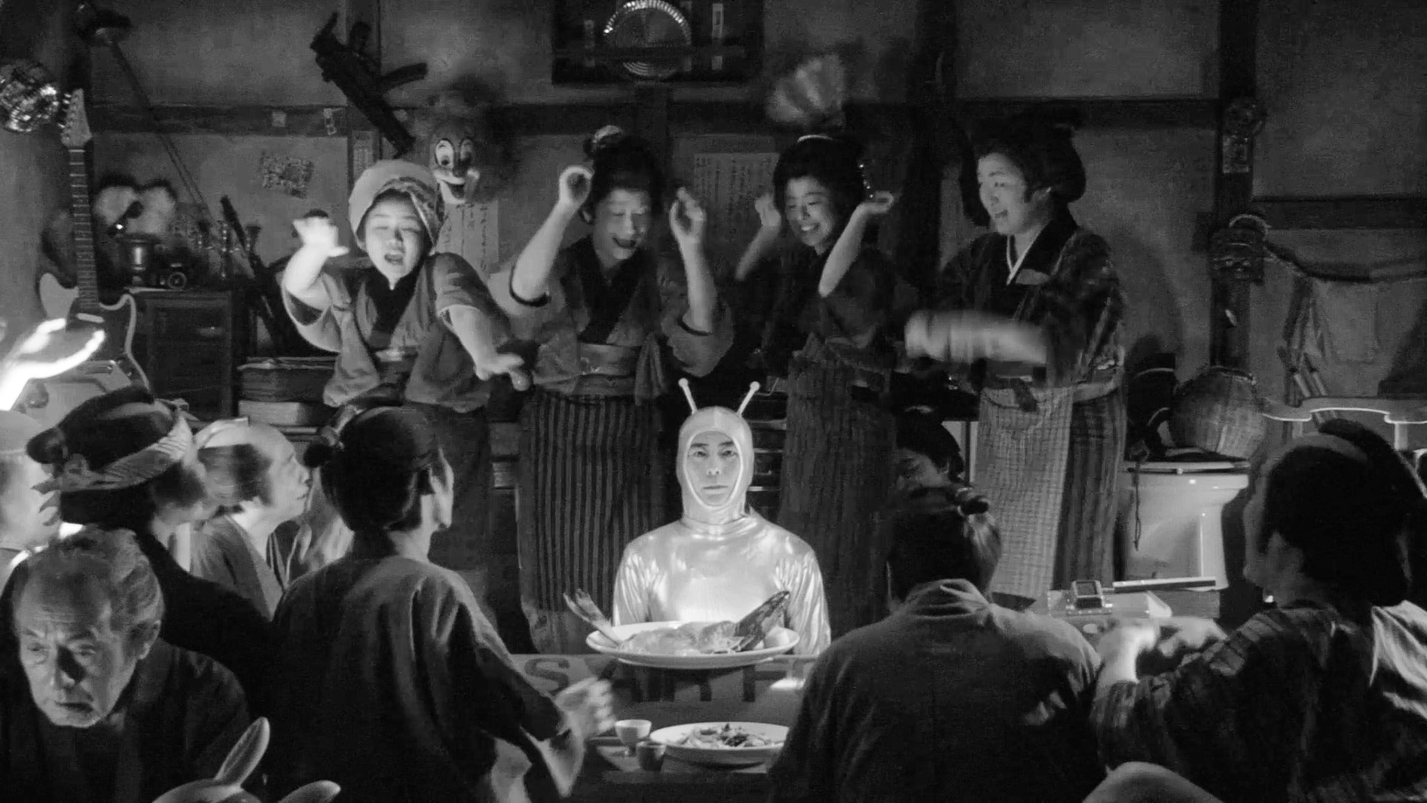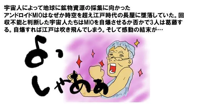 江戸時代の長屋に墜落した円盤。そこから戸板で担ぎ出された宇宙人と長屋の住人たちとの奇妙な交流。それを30分ほどのコメディにした『うちゅうさん』。長屋のワンシチュエーションのドラマはいずれ他の部分を撮り足して長編にする予定でありました。つまり『なぜ墜落したのか』『何のためにやってきたのか』は明かされないままだったのです。出来上がりはまずまずでした。