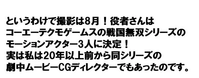 快調に進んでおります!3人の役者さんたちは、コーエーテクモゲームスの「三国無双」「戦国無双」など