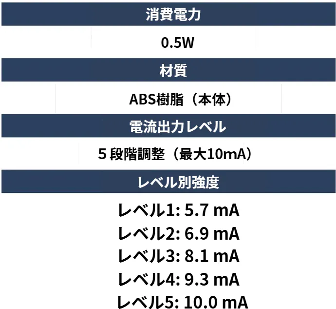 A2. 最大10mAまでの微弱な電流で、ピリピリとした強い刺激ではなく、脈拍のような「じんわり」としたやさしい感覚です。個人差はありますが、不快な痛みはありません。