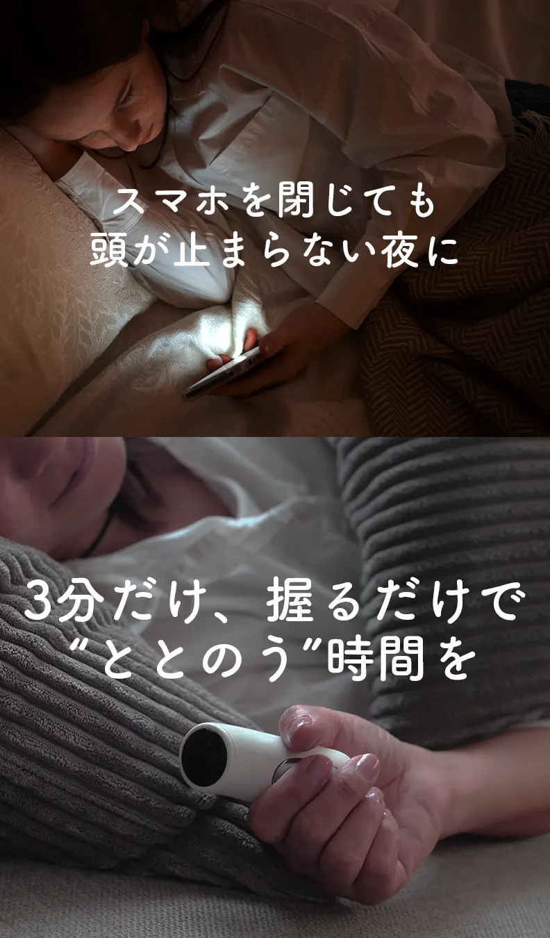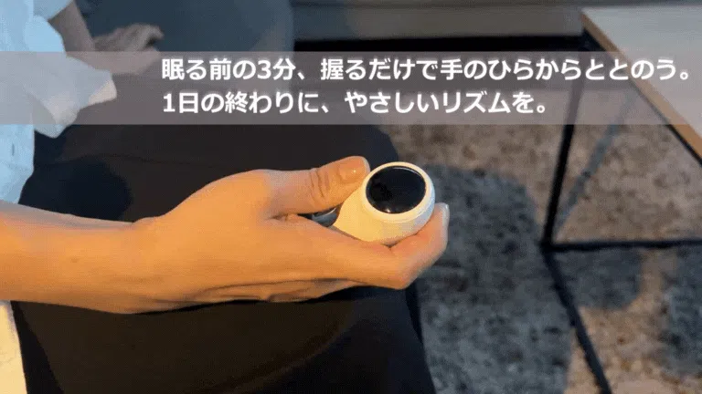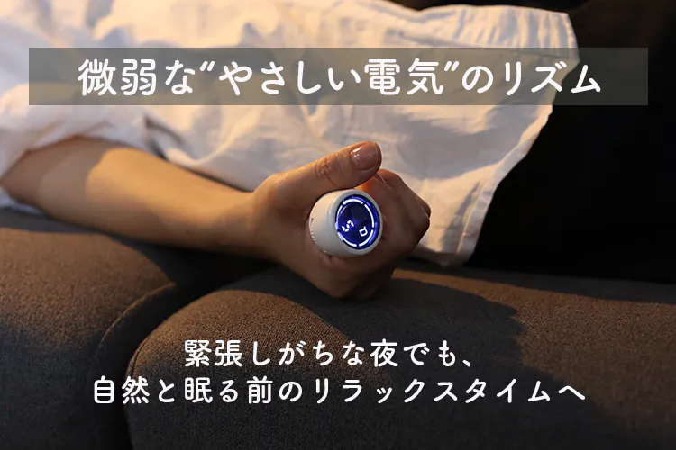 手のひらで軽く握ると、微弱電流がじんわりとやさしく伝わり、まるでリズムを取り戻す合図のようにリラックスへと静かに整えてくれます。音も光もなく、ただ“にぎる”だけ。眠る前の3分が、新しいナイトルーティンに変わりました。