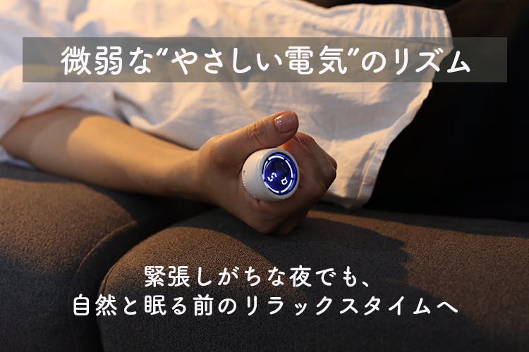 リラックス時の脳波リズムに着想を得た〈ねむまる〉は、手のひらから伝わる微弱電流の“やさしいリズム”で、眠る前の3分を“ととのう時間”へとそっとサポートするウェルネスデバイスです。