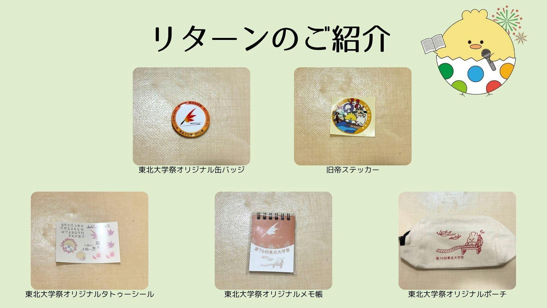 こんにちは!東北大学祭事務局企画局グランドフィナーレです。 今回は、クラウドファンディングの返礼品の詳細をご紹介します!