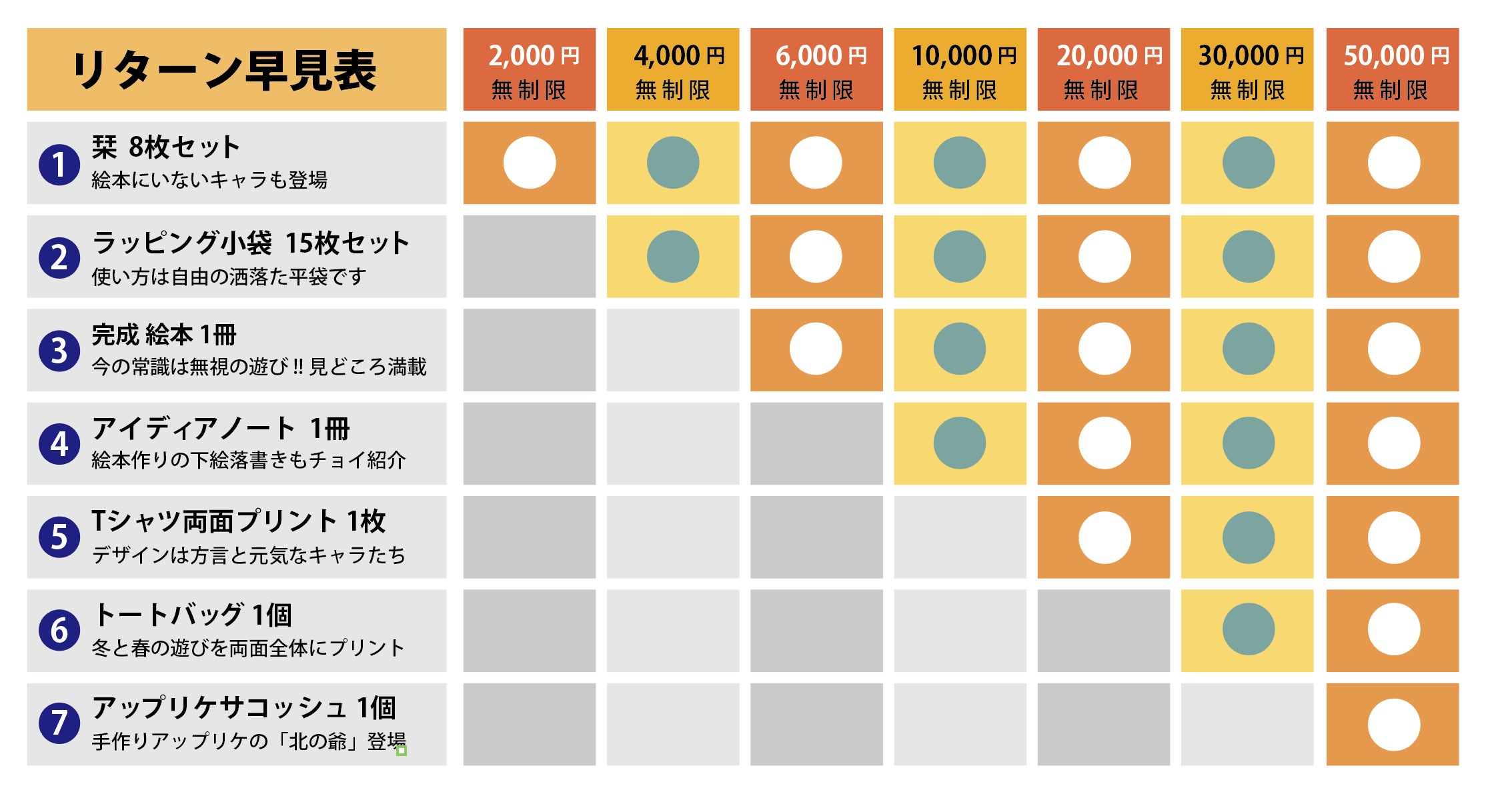 ❶ 栞 8枚セット ❷ ラッピング小袋 15枚セット ❸ 完成絵本 1冊 ❹ アイディアノート 1冊 ❺ Tシャツ両面プリント 1枚 ❻トートバッグ 1個 ❼ アップリケサコッシュ 1個