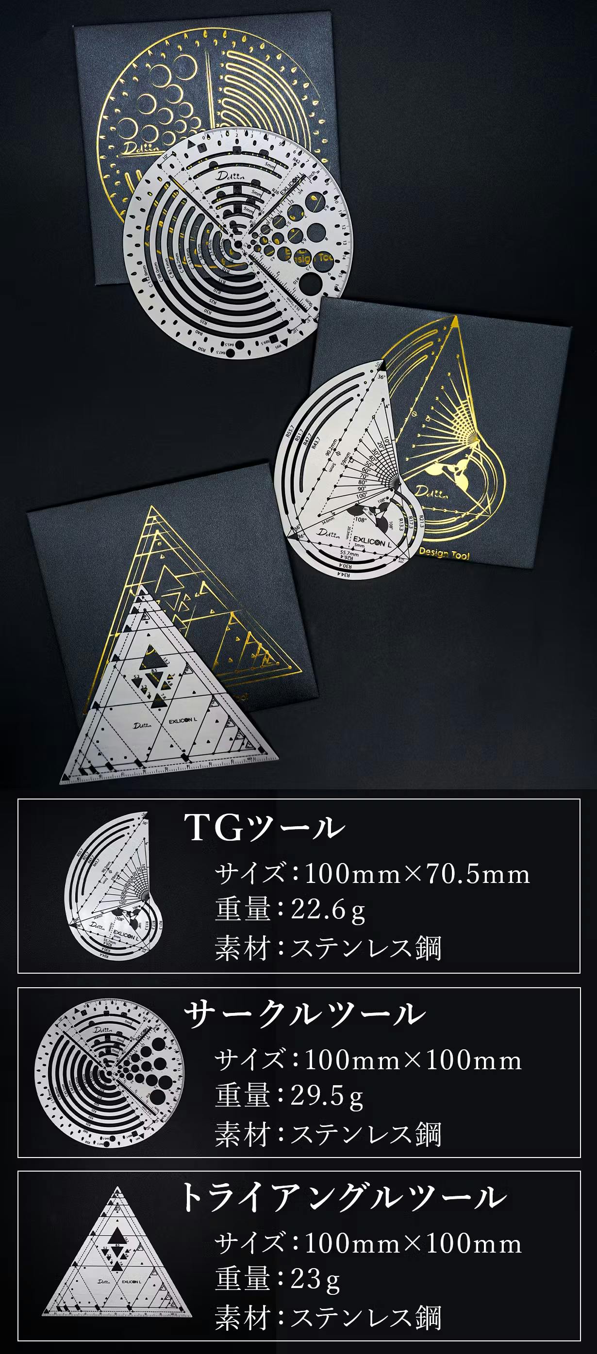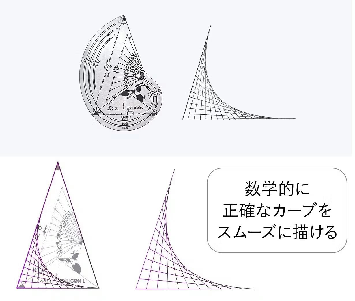 Exlicon Lは建築、グラフィックデザイン、イラスト制作、DIYなど、あらゆる分野で必要とされる多機能性を兼ね備えています。例えば、黄金比を使ったスパイラルや三角形、複雑な曲線の作図が簡単にでき、デザインやアート作品の精度が向上します。また、正確な角度測定や、ミリメートルとインチでのサイズ調整が可能で、細かい部分まで精密に作業を進めることができます。このように、Exlicon Lは多くの機能を1つのツールに集約し、作業のスピードと精度を高めることができます。
