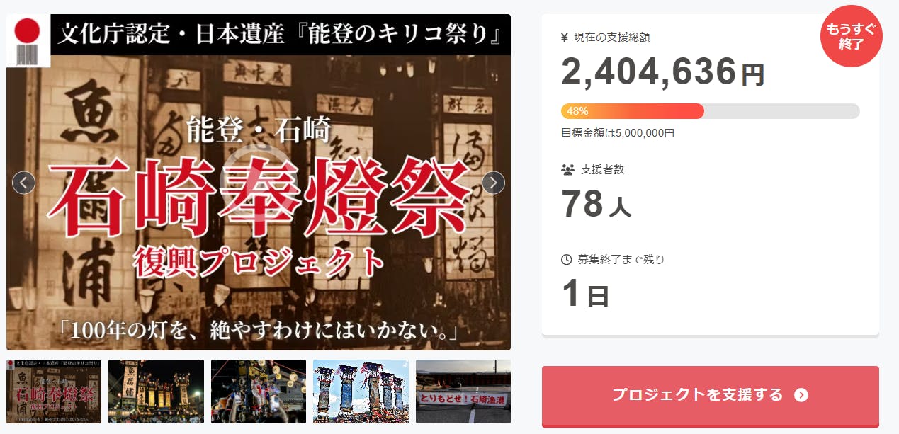 2025/08/30 21:46今回のプロジェクトにご支援いただいた皆さま、本当にありがとうございます。https://camp-fire.jp/mypage/projects/855422振り返れば、私たちがスタートした時には「どれだけの方に想いが届くだろうか」という不安もありました。しかし今、画面に映る 78名もの方々からのご支援、そして 2,400,000円を超えるご厚情 が積み重なっていることに、心からの感謝でいっぱいです。皆さまお一人おひとりの応援が、私たちの背中を押し、石崎の灯りを未来へつなぐ確かな力となりました。本当にありがとうございます。プロジェクトは、いよいよ明日で終了となります。「100年の灯を、絶やすわけにはいかない」——その思いで走り抜けてきました。どうか最後まで、この石崎のことを見守ってください。そしてもし周りの方に、この想いを共有していただけるなら、ぜひ一緒に未来へとつなげていただけると嬉しいです。改めて、ここまで支えてくださった皆さまに、最高の感謝を込めて。石崎奉燈祭奉賛会 一同 もっと見る