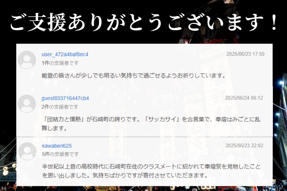 ついに今週土曜日、8月2日。石崎奉燈祭が2年ぶりに、通常開催されます!震災から1年半。道路の整備、危険家屋の撤去、提灯の飾りつけなど、地域の皆さんとともに、この数週間で急ピッチで準備を進めてきました。そして先日、東三区の奉燈の正面に掲げる大文字が6年ぶりに新調されました。地元の皆さんが見守る中、力強く「志欲静」の3文字が揮毫され、その文字には「石崎の元気を取り戻したい」という想いが込められています。「本当にできるのか?」そんな不安と隣り合わせだった日々。でも、皆さんからの温かい応援と支援の言葉に、どれだけ勇気づけられたか、言葉にできません。おかげさまで、現在56名の方からご支援をいただき、140万円超のご支援が集まっています。本当にありがとうございます。https://camp-fire.jp/projects/855422/viewただ、まだ準備にかかる費用すべてをまかなうにはまだまだです。「今からでも応援したい」「当日は行けないけれど、力になりたい」そんな方がいらっしゃいましたら、どうか、石崎のこの一歩を後押ししてください。この祭りは、地域の光であり、未来への希望です。どうぞ、引き続きよろしくお願いいたします!https://camp-fire.jp/projects/855422/view