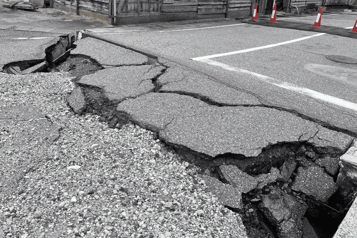 アスファルトも地震で壊れ、今でも通行止めの場所も