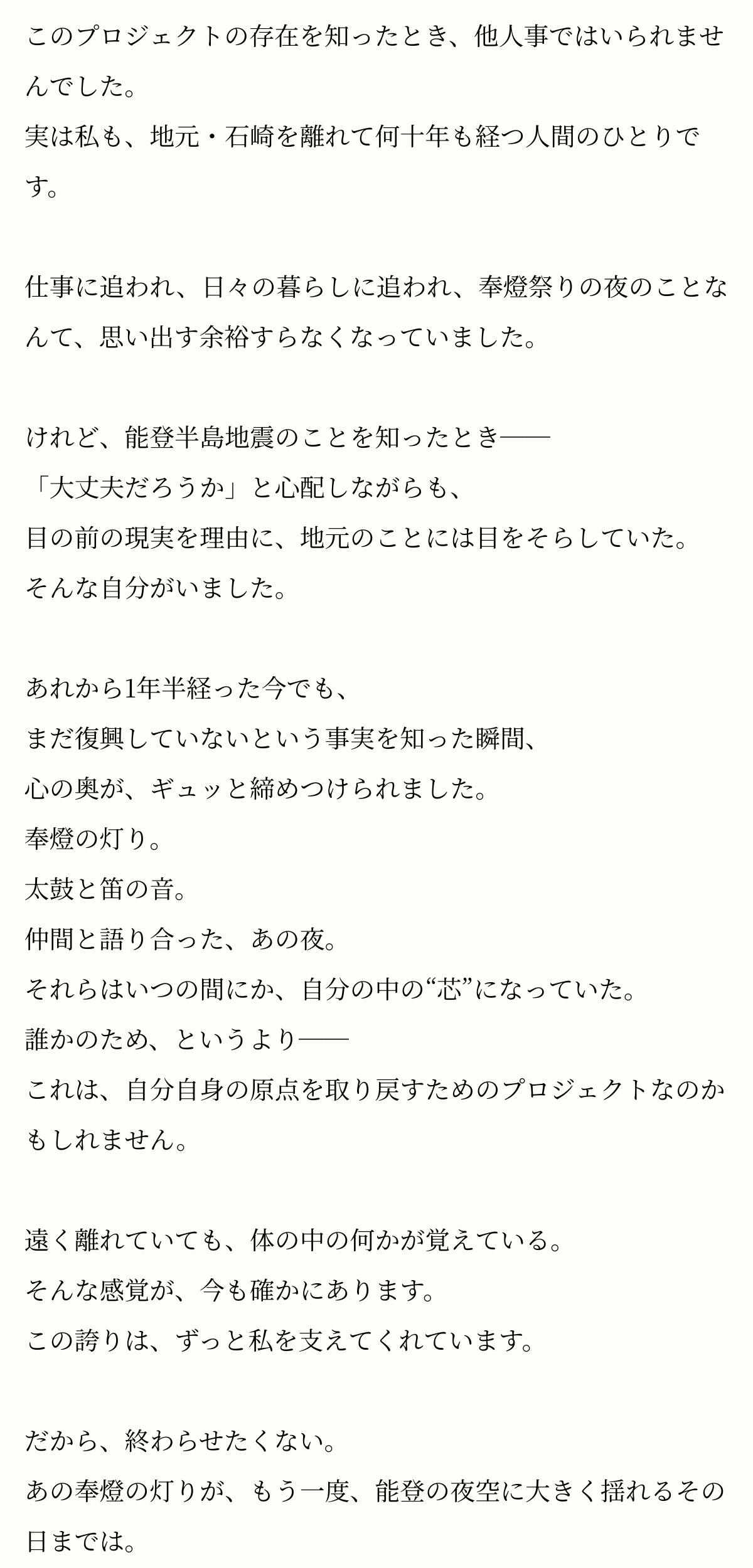2025/08/30 21:46今回のプロジェクトにご支援いただいた皆さま、本当にありがとうございます。https://camp-fire.jp/mypage/projects/855422振り返れば、私たちがスタートした時には「どれだけの方に想いが届くだろうか」という不安もありました。しかし今、画面に映る 78名もの方々からのご支援、そして 2,400,000円を超えるご厚情 が積み重なっていることに、心からの感謝でいっぱいです。皆さまお一人おひとりの応援が、私たちの背中を押し、石崎の灯りを未来へつなぐ確かな力となりました。本当にありがとうございます。プロジェクトは、いよいよ明日で終了となります。「100年の灯を、絶やすわけにはいかない」——その思いで走り抜けてきました。どうか最後まで、この石崎のことを見守ってください。そしてもし周りの方に、この想いを共有していただけるなら、ぜひ一緒に未来へとつなげていただけると嬉しいです。改めて、ここまで支えてくださった皆さまに、最高の感謝を込めて。石崎奉燈祭奉賛会 一同 もっと見る