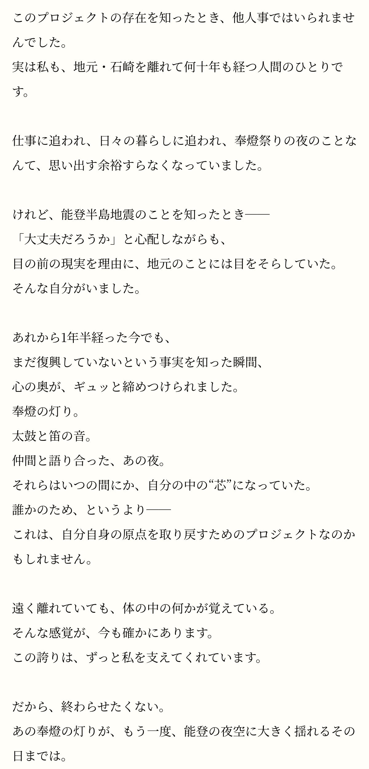 地元を離れた人。石崎を知らなかったけれど、想いに共感してくれた人。文化を残したいと思ってくれるすべての人に、支援という形で加わっていただければ幸いです。