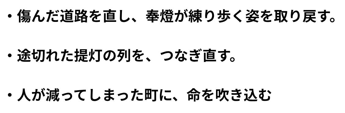 私たちは「灯を取り戻す」のではなく、「町の心臓を動かす」ために、再び“本来の形”で祭りを行うことを決意しました。