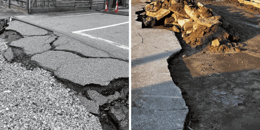 アスファルトも地震で壊れ、今でも通行止めの場所も