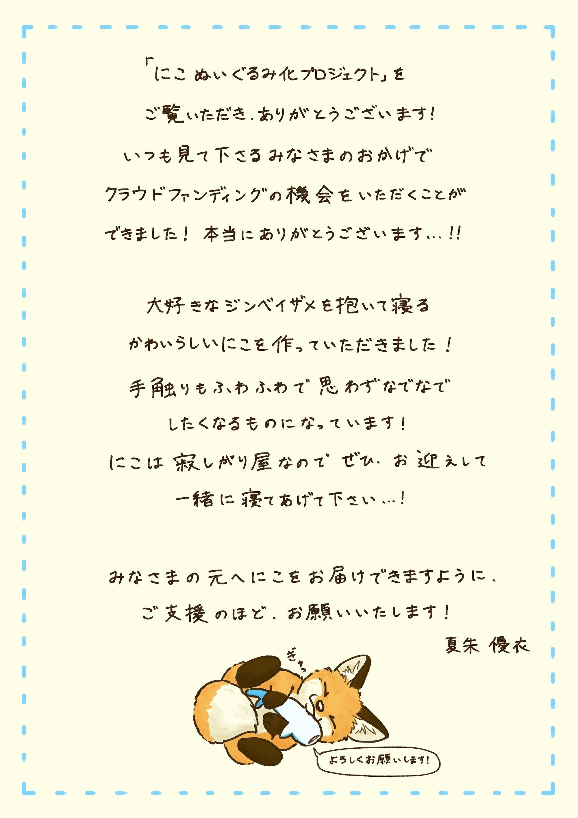 イラストレーター夏朱優衣が描くキツネ「にこ」がぬいぐるみ化に挑戦します!!