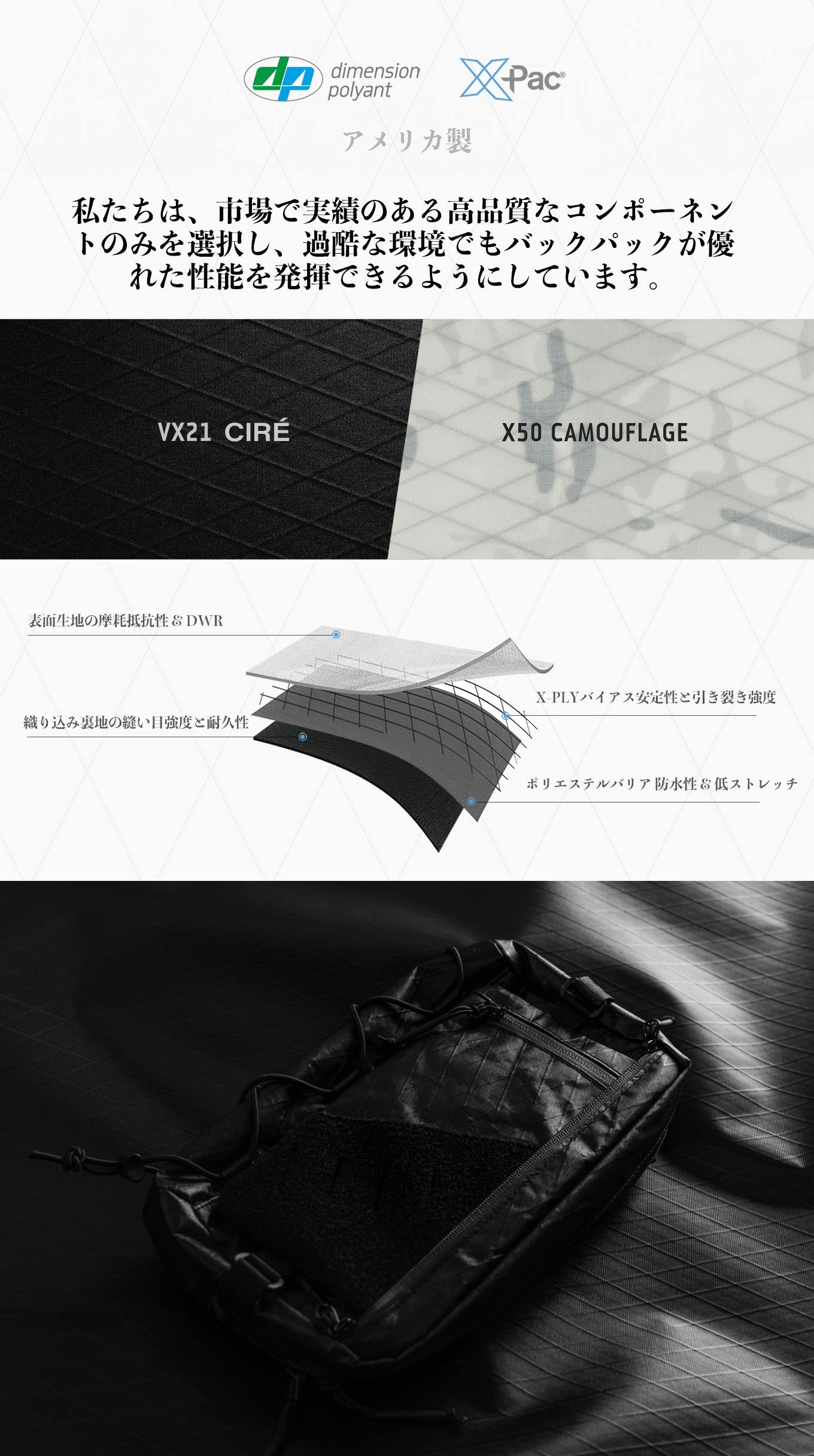 素材はXPACまたは自社開発ナイロン生地、防水・耐摩耗・軽量性を兼ね備えています。
