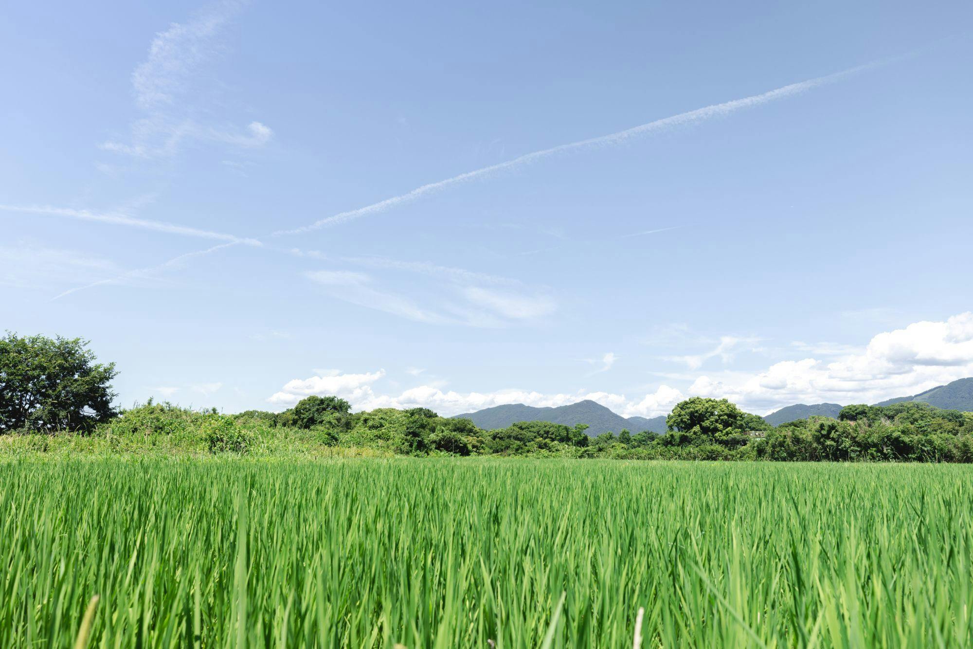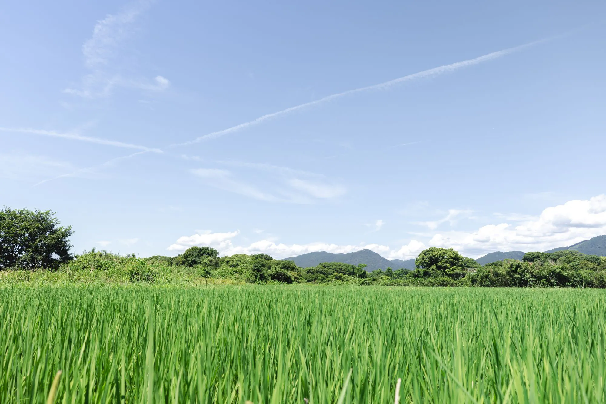 佐賀平野・吉野ヶ里に広がるえこびと農園の田園風景。脊振山から流れるきれいな水でお米は育っています。