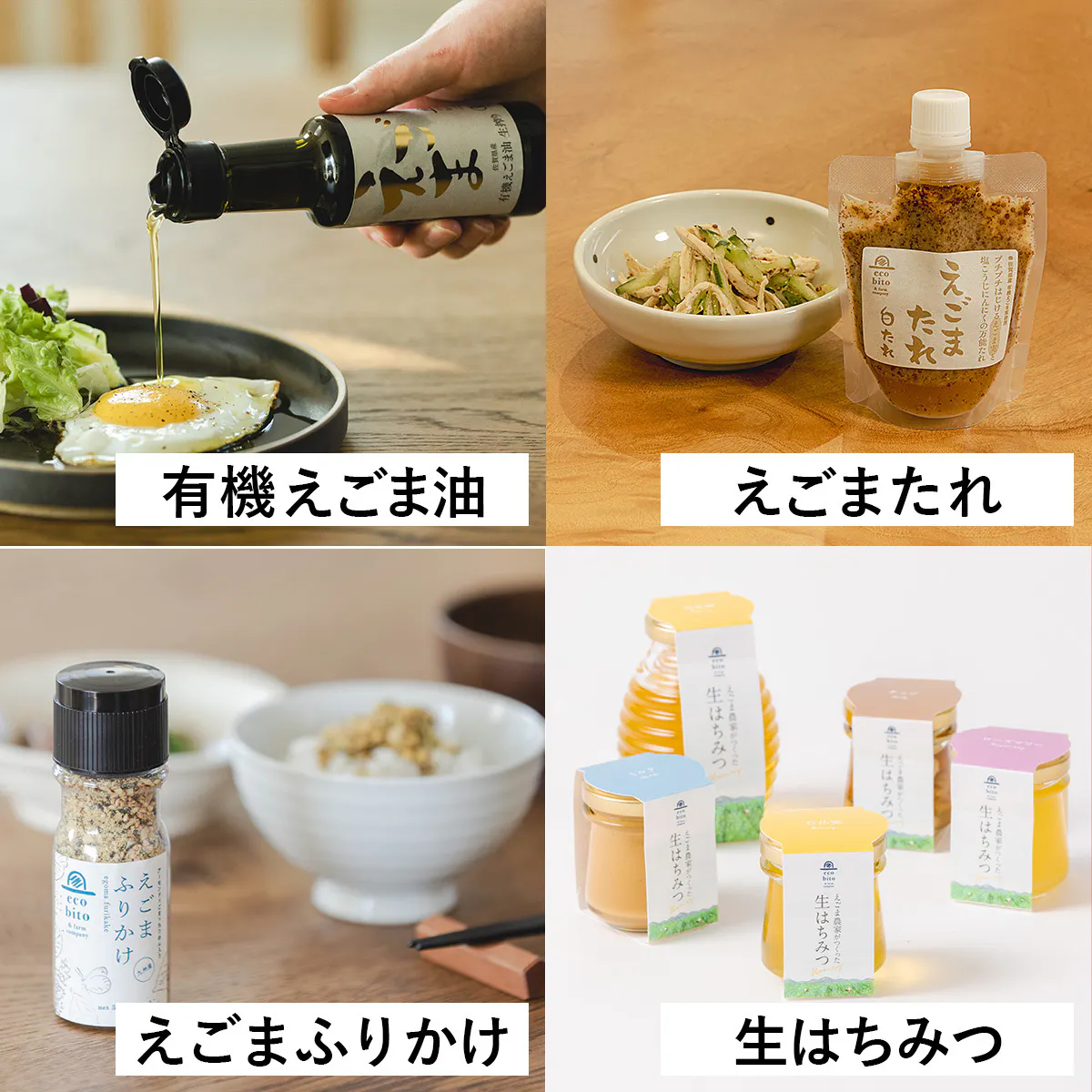 えごま油は熱を加えない生しぼり製法。酸化を抑え、フレッシュな状態でお届けしています。そして、えごまの美味しさを伝えたい!そんな想いで作った6次化商品も多数販売!