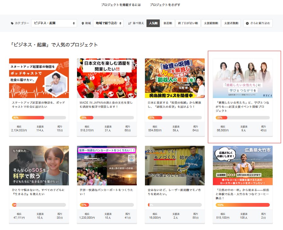 みなさまの応援のおかげで、現在WECAのクラウドファンディングが「ビジネス・起業」カテゴリのトップに掲載されています!
