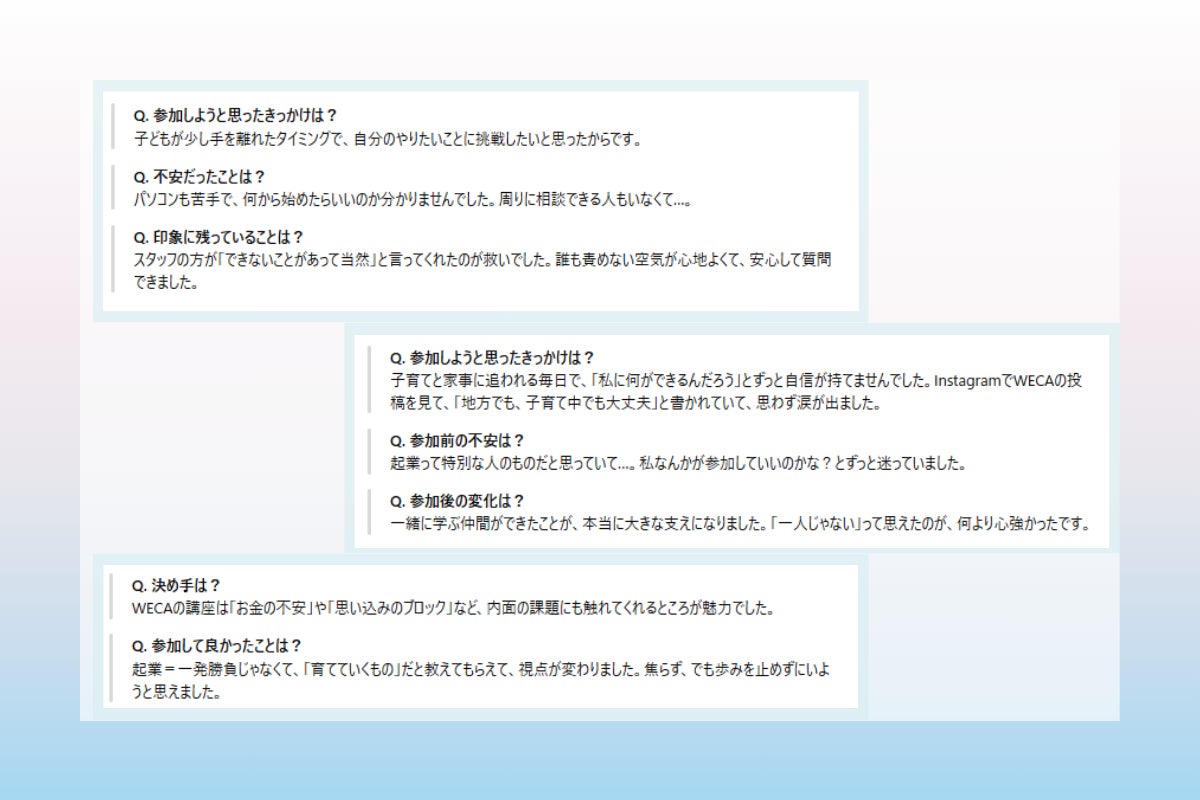 私たちWECA(女性起業家支援協会)は、「挑戦したい女性たちが、安心してビジネスに取り組める環境」を整えるために、起業支援と教育のプログラムを立ち上げました。