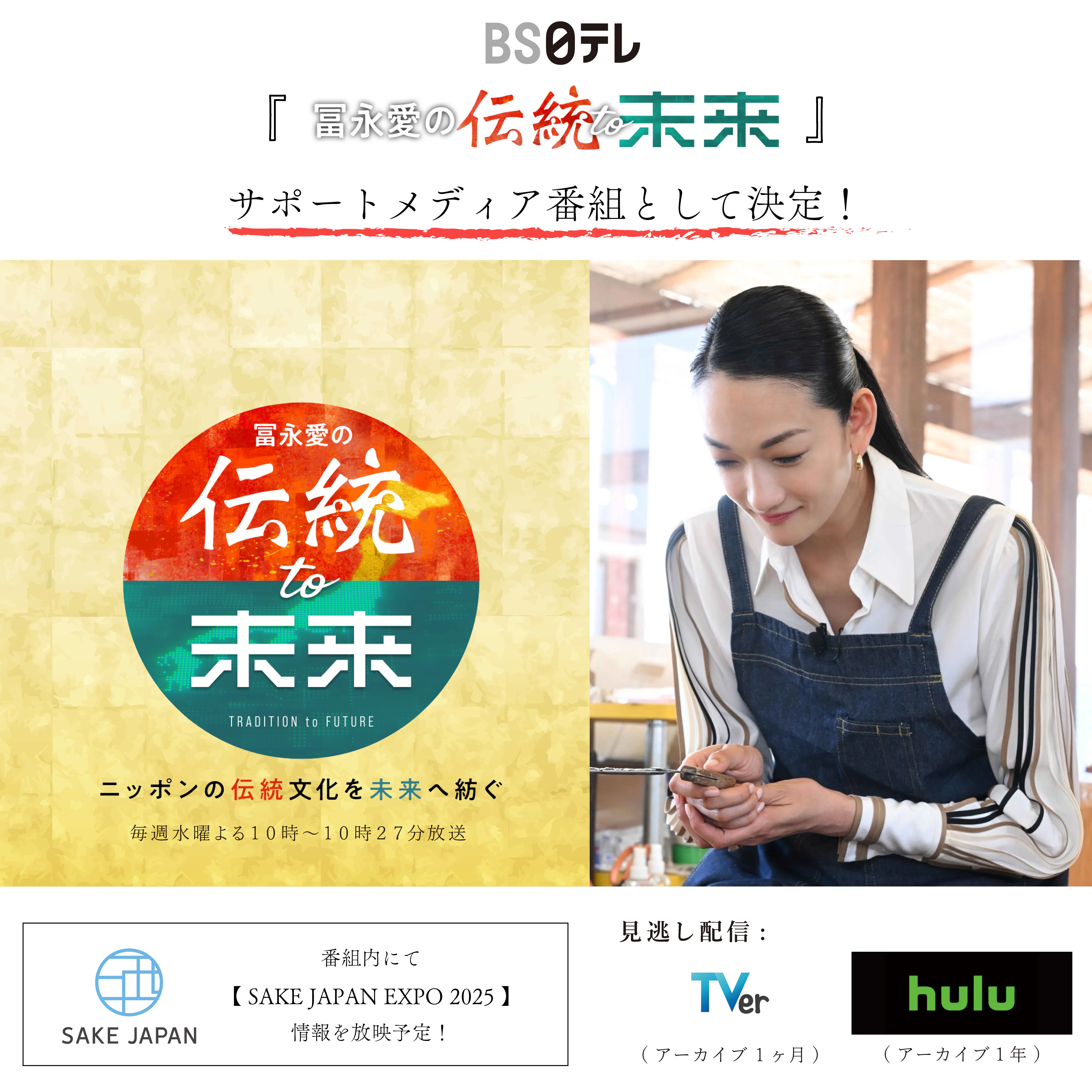 BS日テレ『冨永愛の伝統 to 未来』サポートメディア番組に決定冨永愛が日本全国を訪ね、その地に根付く伝統文化とその未来を紹介していく番組内にて、『SAKE JAPAN EXPO 2025』イベント情報や、当日の様子が放送決定!