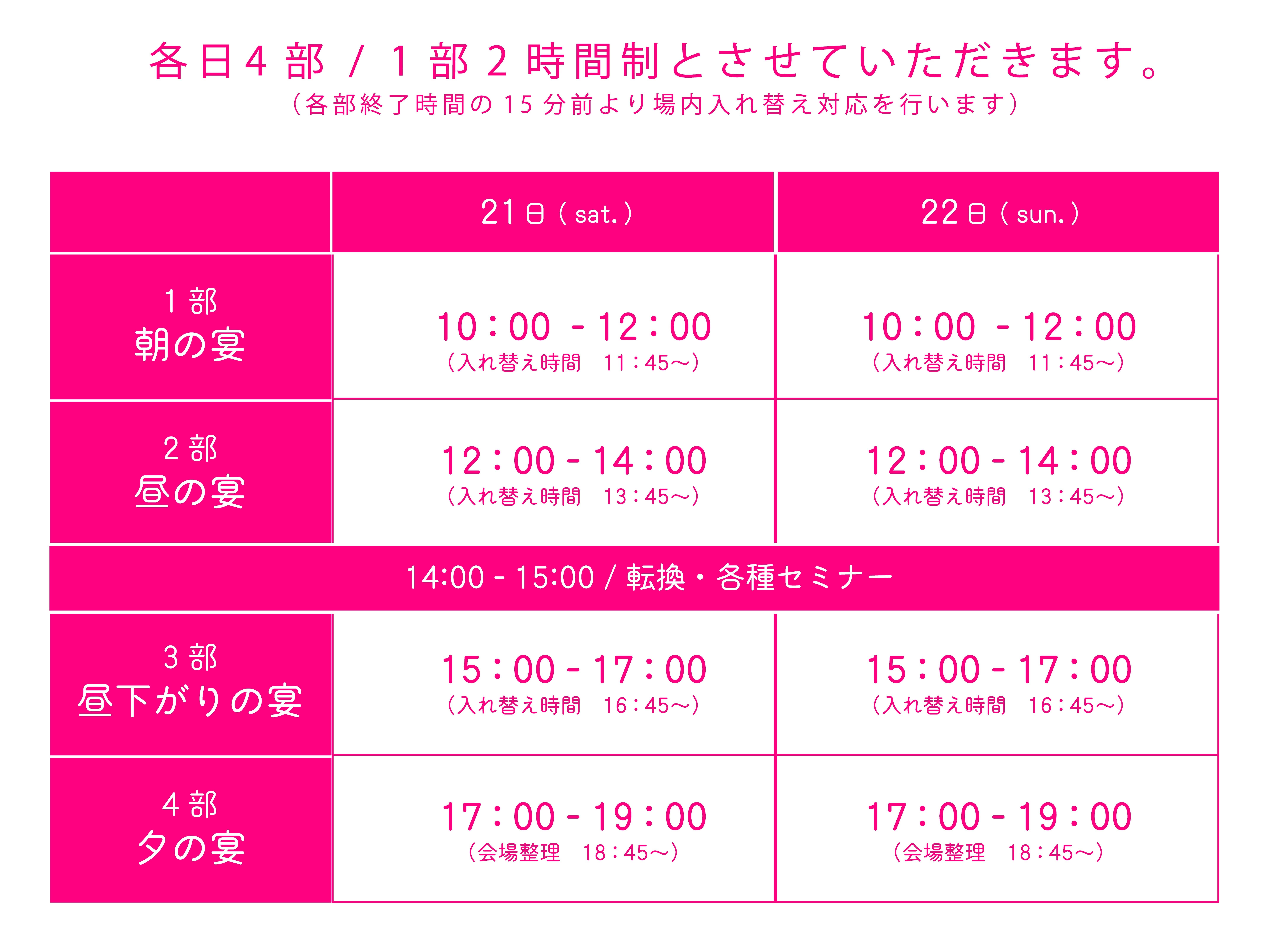 時間:両日4部制(各部2時間制となり、終了時間の15分前に入れ替えをお願いします。)